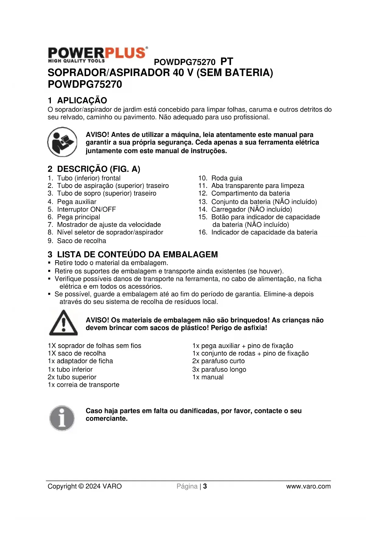 Copyright © 2024 VARO Página | 3 www.varo.com SOPRADOR/ASPIRADOR 40 V (SEM BATERIA) POWDPG75270 1 APLICAÇÃO O soprador/aspirador de jardim está concebido para limpar folhas, caruma e outros detritos do seu relvado, caminho ou pavimento. Não adequado para uso profissional. AVISO! Antes de utilizar a máquina, leia atentamente este manual para garantir a sua própria segurança. Ceda apenas a sua ferramenta elétrica juntamente com este manual de instruções. 2 DESCRIÇÃO (FIG. A)