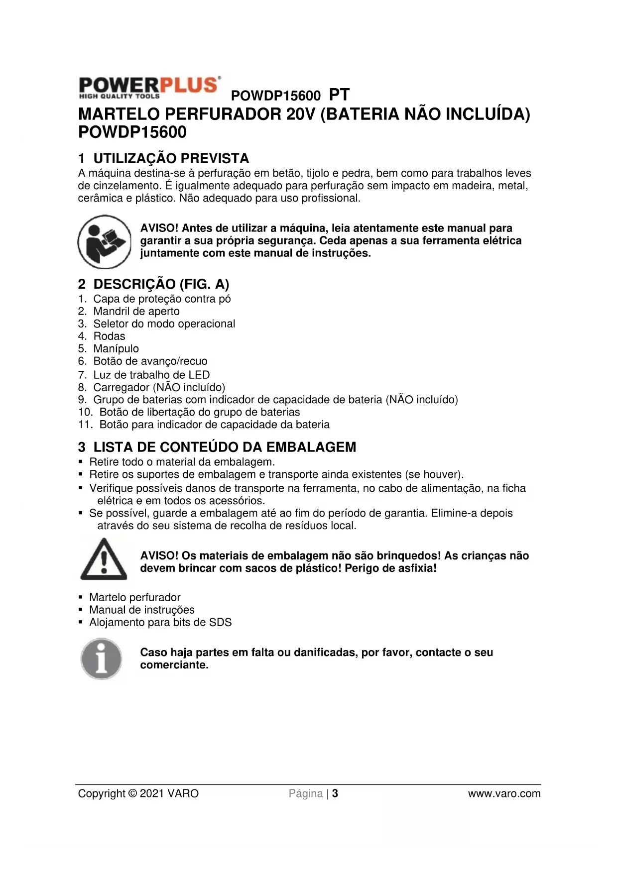 VARO – VIC. VAN ROMPUY N.V. – Joseph Van Instraat 9 – BE2500 Lier – Bélgica, declara que, Designação do aparelho: Martelo perfurador 20V (BATERIA NÃO INCLUÍDA) Marca: POWERplus Modelo nº.: POWDP15600 se encontra em conformidade com os requisitos essenciais e outras provisões relevantes das Diretivas Comunitárias aplicáveis, com base na aplicação das normas Europeias harmonizadas. Qualquer alteração não autorizada do equipamento anula esta declaração. Diretivas Europeias (incluindo, se aplicável, as respetivas emendas até à data de assinatura): 2011/65/UE 2006/42/CE 2014/30/UE Normas Europeias harmonizadas (incluindo, se aplicável, as respetivas emendas até à data de assinatura): EN60745-1 : 2009 EN60745-2-6 : 2010 EN55014-1 : 2017 EN55014-2 : 2015 Detentor da Documentação Técnica: Philippe Vankerkhove, VARO – Vic. Van Rompuy N.V. O signatário atua em nome da administração da empresa, Ludo Mertens Assuntos Regulamentares – Gestor de Conformidade 23/08/2021, Lier - BélgicaPOWDP15600 NO Copyright © 2021 VARO S i d e | 1 www.varo.com 1 TILTENKT BRUK ............................................................................... 3