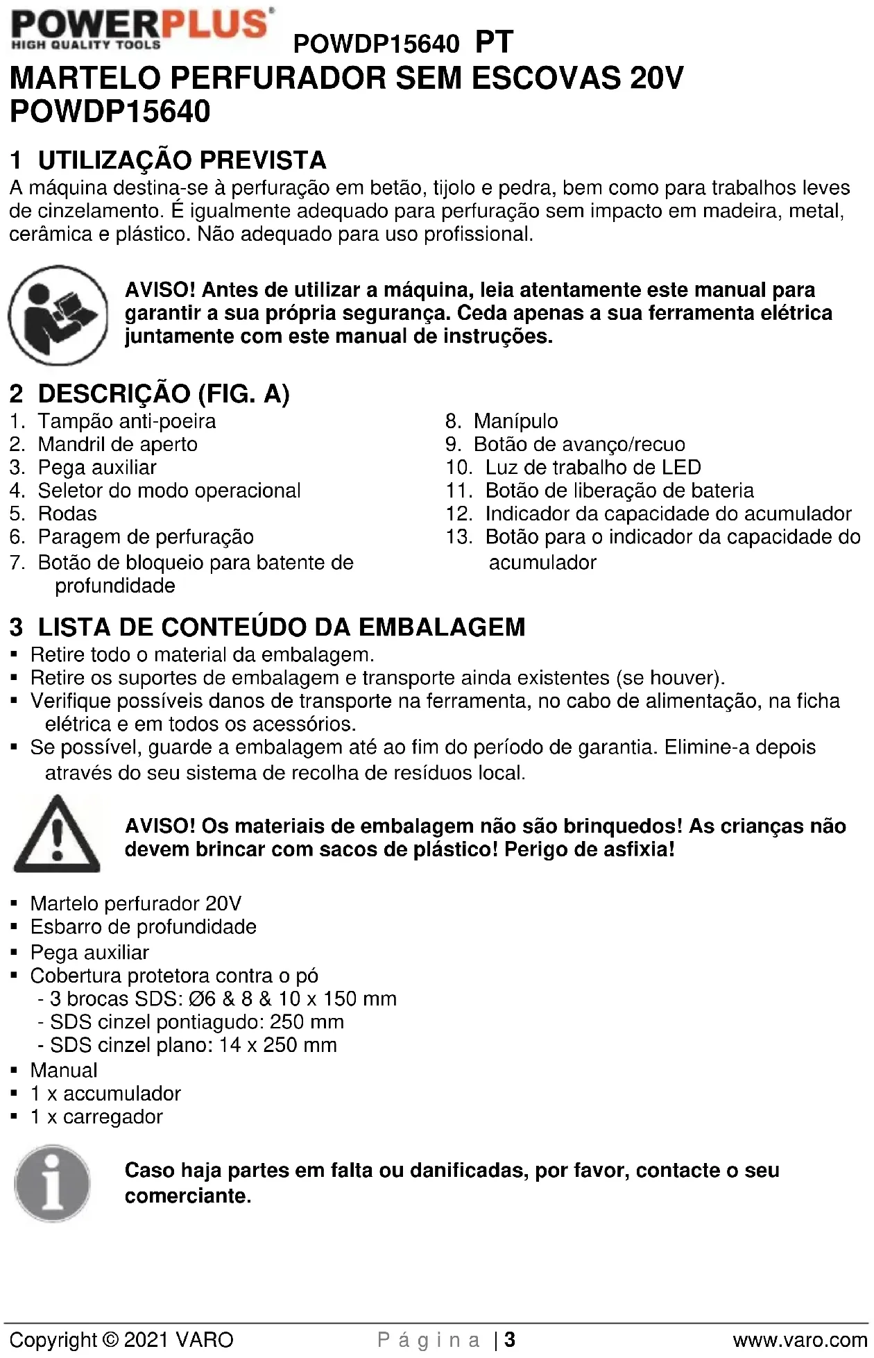 AVISO! Antes de utiliser a boa, leia atentamente este manual para garantir a sua propria seguranca. Ceda apenas a sua ferramenta eletrica jintamente com este manual de instruções.