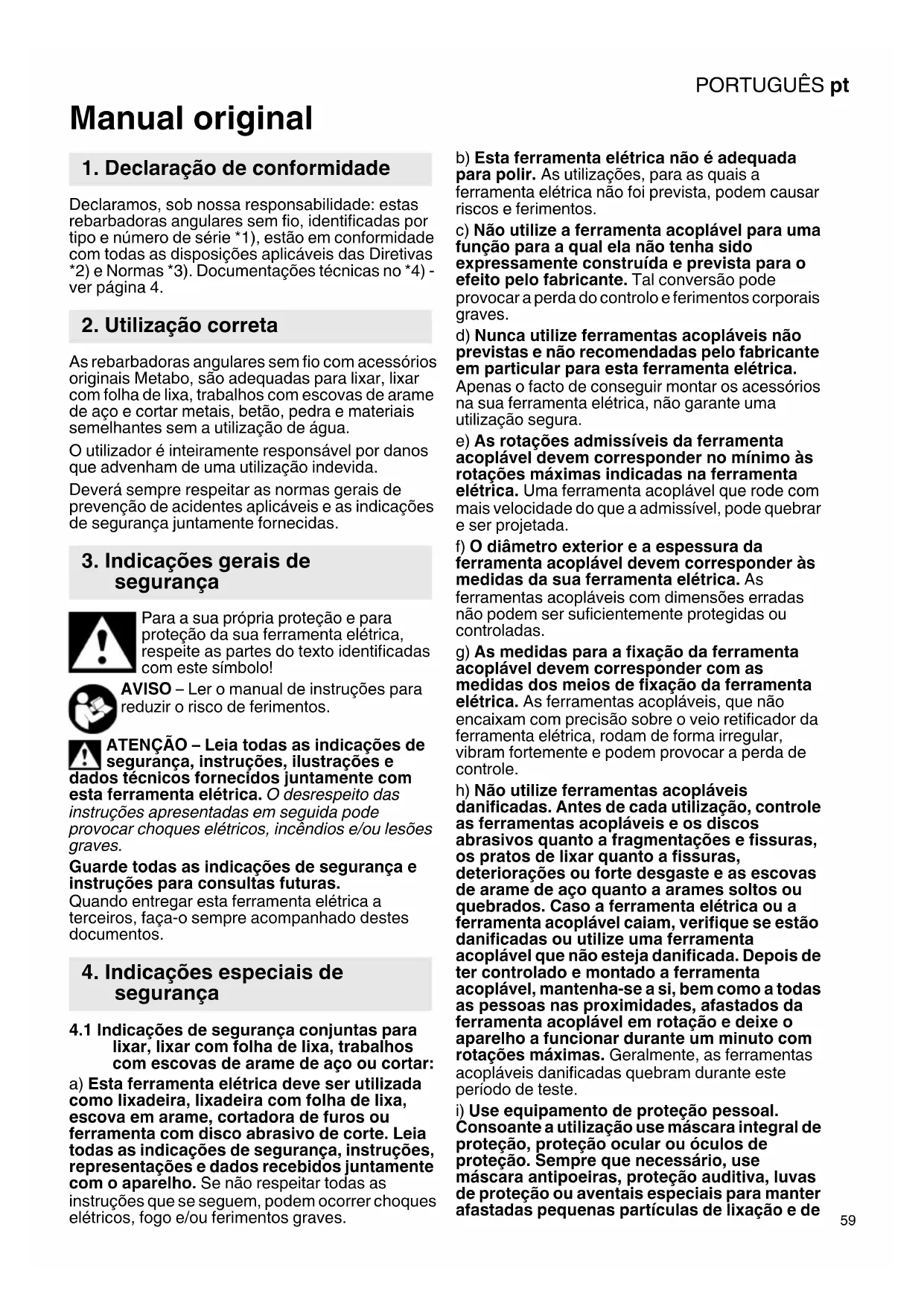 Manual original Declaramos, sob nossa responsabilidade: estas rebarbadoras angulares sem fio, identificadas por tipo e número de série *1), estão em conformidade com todas as disposições aplicáveis das Diretivas *2) e Normas *3). Documentações técnicas no *4) - ver página 4. As rebarbadoras angulares sem fio com acessórios originais Metabo, são adequadas para lixar, lixar com folha de lixa, trabalhos com escovas de arame de aço e cortar metais, betão, pedra e materiais semelhantes sem a utilização de água. O utilizador é inteiramente responsável por danos que advenham de uma utilização indevida. Deverá sempre respeitar as normas gerais de prevenção de acidentes aplicáveis e as indicações de segurança juntamente fornecidas. Para a sua própria proteção e para proteção da sua ferramenta elétrica, respeite as partes do texto identificadas com este símbolo! AVISO – Ler o manual de instruções para reduzir o risco de ferimentos. ATENÇÃO – Leia todas as indicações de segurança, instruções, ilustrações e dados técnicos fornecidos juntamente com esta ferramenta elétrica. O desrespeito das instruções apresentadas em seguida pode provocar choques elétricos, incêndios e/ou lesões graves. Guarde todas as indicações de segurança e instruções para consultas futuras. Quando entregar esta ferramenta elétrica a terceiros, faça-o sempre acompanhado destes documentos.