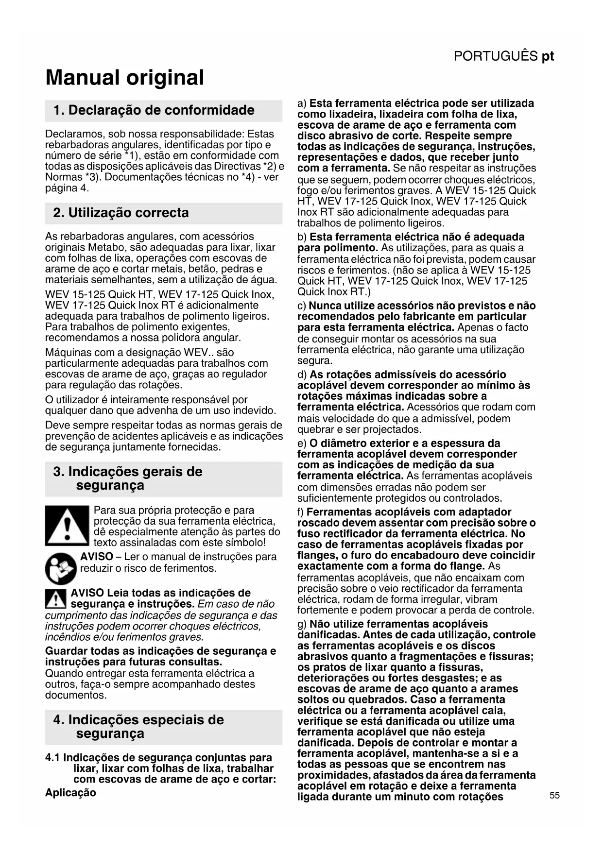 a)Esta ferramenta eletrica pode ser realizada como lixadeira, lixadeira com folha de lixa, escova de arame de aço e ferramenta com disco abrasivo de corte. Respeite sempre todas as indicações de segurança, instruções, representações e dados, que receber muito com a ferramenta. Se não respeitar as instruções que se seguem, poder ocorrer choques eletricos, fogo e/ou ferimentos graves. A WEV 15-125 Quick HT, WEV 17-125 Quick Inox, WEV 17-125 Quick Inox RT são adicondionalmente adequadas para tratativas de polimento ligeiros.