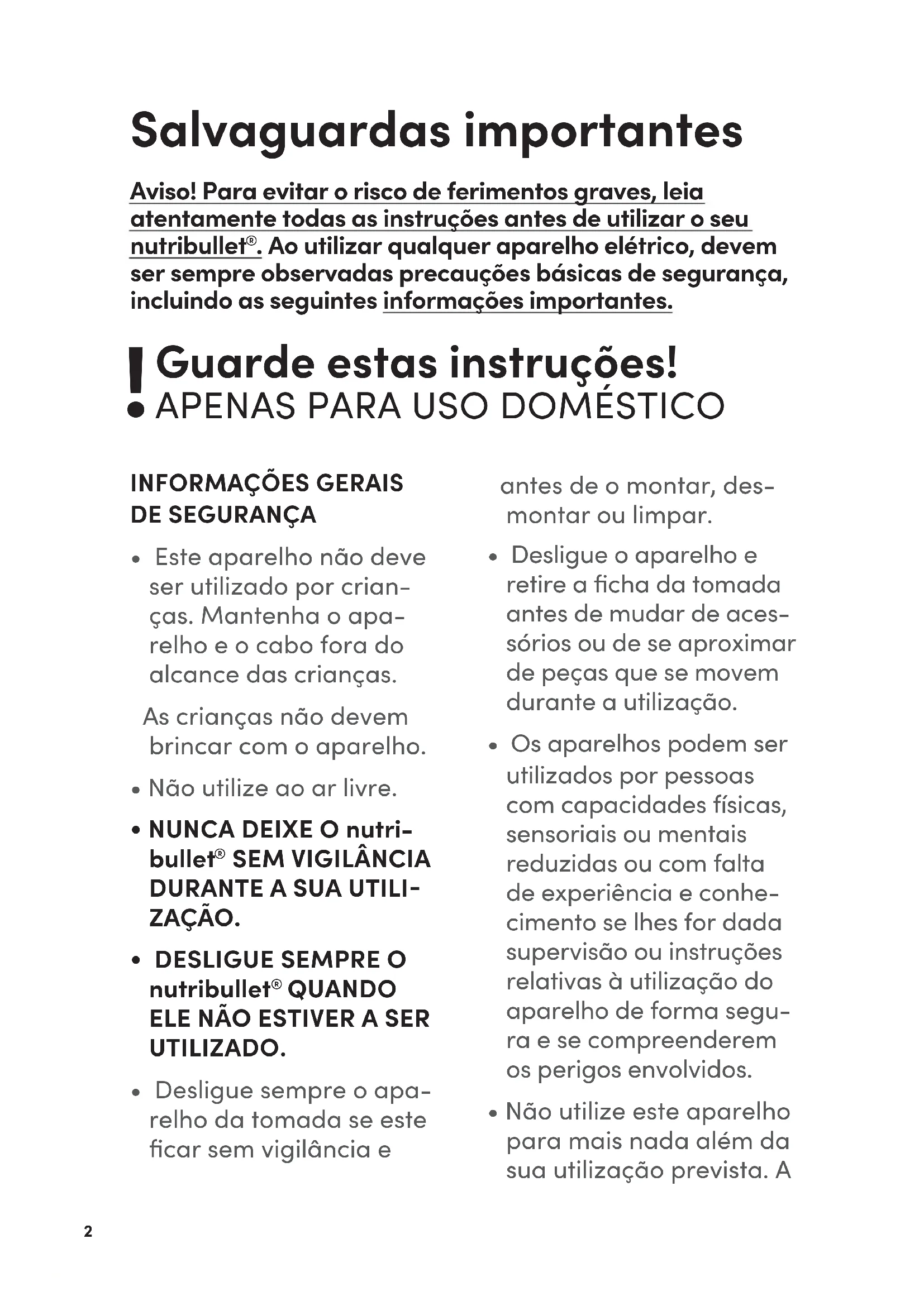- Desligue sempre o apa- relho da tomada se este ficar sem vigilância e Salvaguardas importantes Aviso! Para evitar o risco de ferimentos graves, leia atentamente todas as instruções antes de utilizar o seu nutribullet