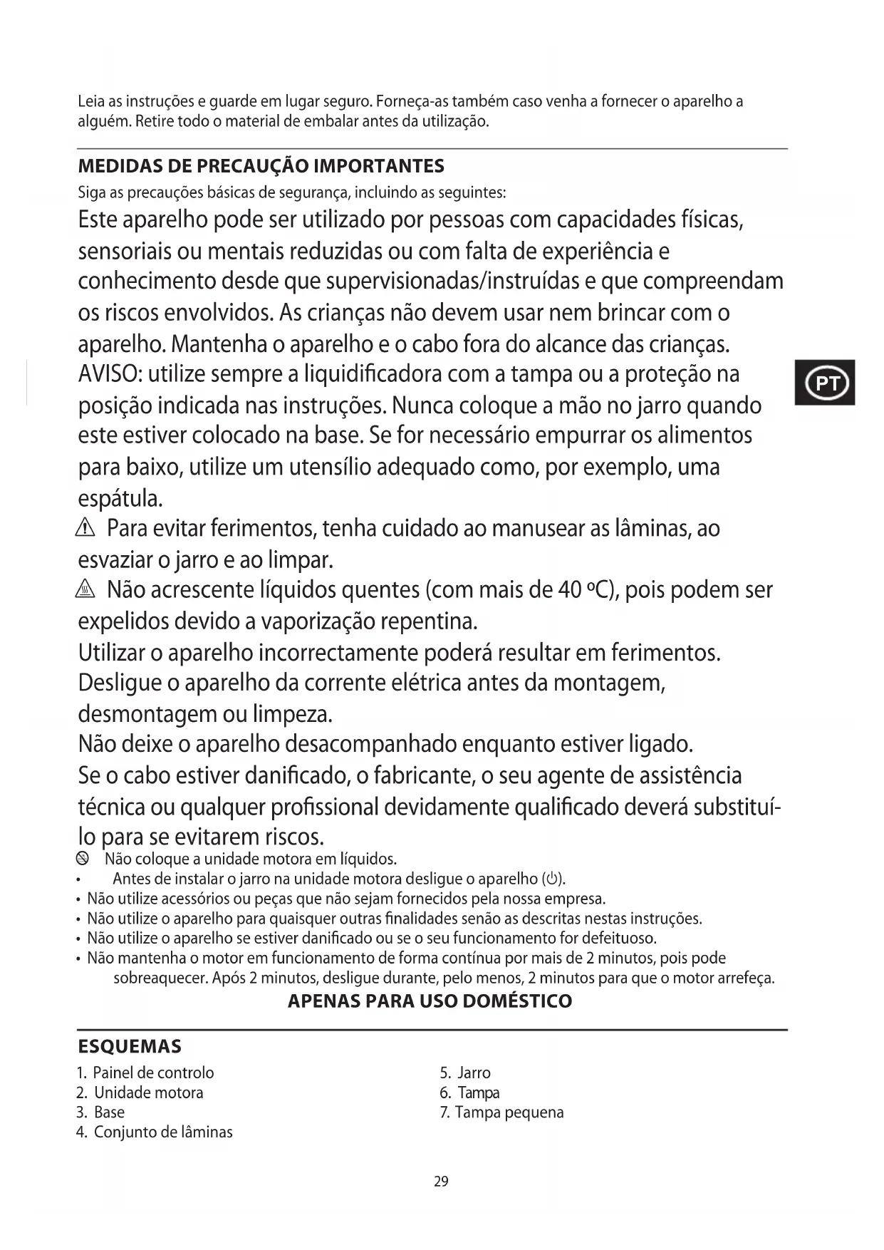 Siga as precauções básicas de segurança, incluindo as seguintes: Este aparelho pode ser utilizado por pessoas com capacidades físicas, sensoriais ou mentais reduzidas ou com falta de experiência e conhecimento desde que supervisionadas/instruídas e que compreendam os riscos envolvidos. As crianças não devem usar nem brincar com o aparelho. Mantenha o aparelho e o cabo fora do alcance das crianças. AVISO: utilize sempre a liquidicadora com a tampa ou a proteção na posição indicada nas instruções. Nunca coloque a mão no jarro quando este estiver colocado na base. Se for necessário empurrar os alimentos para baixo, utilize um utensílio adequado como, por exemplo, uma espátula. c Para evitar ferimentos, tenha cuidado ao manusear as lâminas, ao esvaziar o jarro e ao limpar. h Não acrescente líquidos quentes (com mais de 40 ºC), pois podem ser expelidos devido a vaporização repentina. Utilizar o aparelho incorrectamente poderá resultar em ferimentos. Desligue o aparelho da corrente elétrica antes da montagem, desmontagem ou limpeza. Não deixe o aparelho desacompanhado enquanto estiver ligado. Se o cabo estiver danicado, o fabricante, o seu agente de assistência técnica ou qualquer prossional devidamente qualicado deverá substituí- lo para se evitarem riscos. l Não coloque a unidade motora em líquidos.