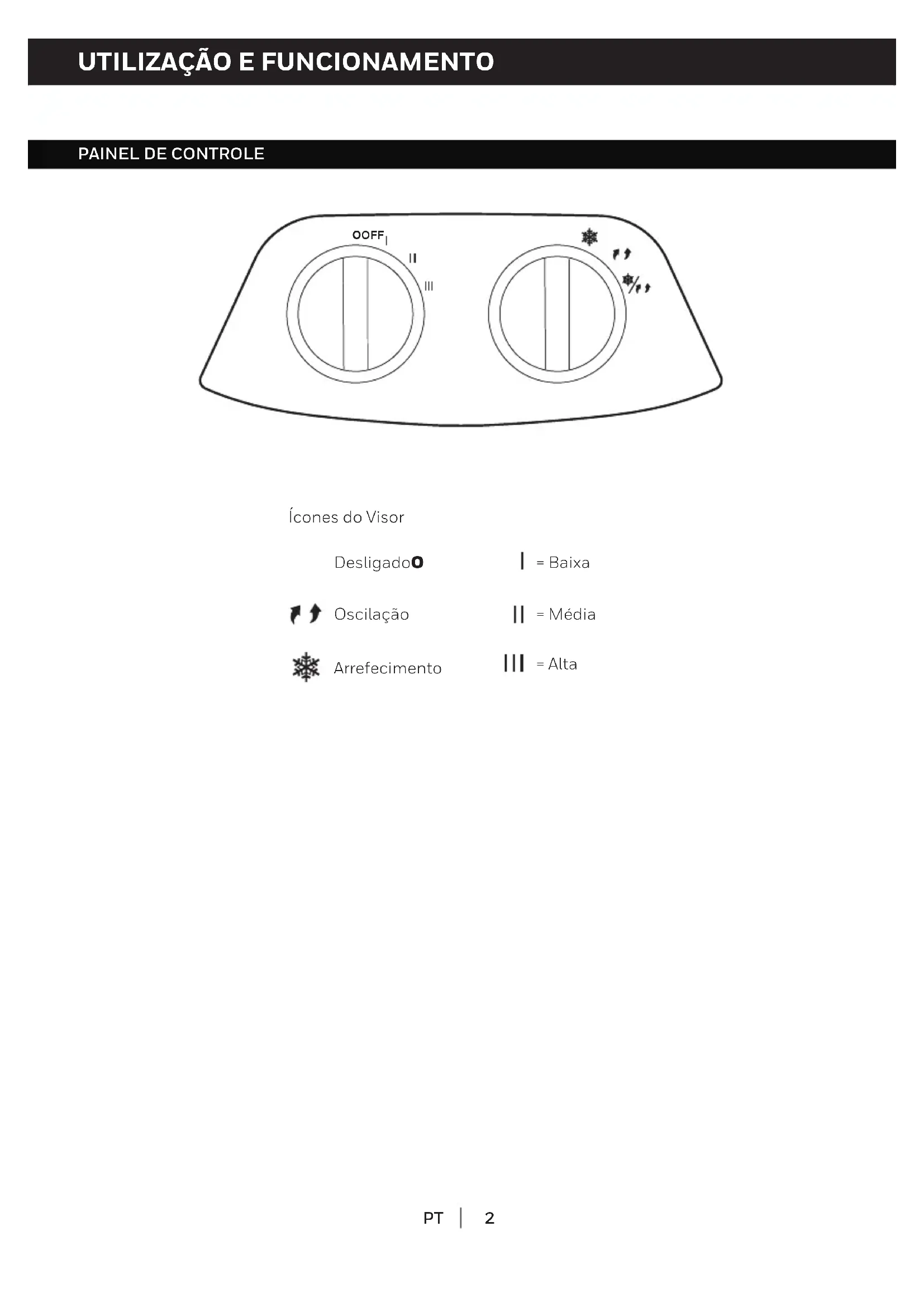 VELOCIDADE Conecte à tomada e gire o botão VELOCIDADE. A ventoinha vai iniciar. Altere a velocidade da ventoinha de Baixa a Alta (| para Baixa, || para Média e ||| para velocidade Alta). Para desligar o aparelho, rode o botão VELOCIDADE para O.