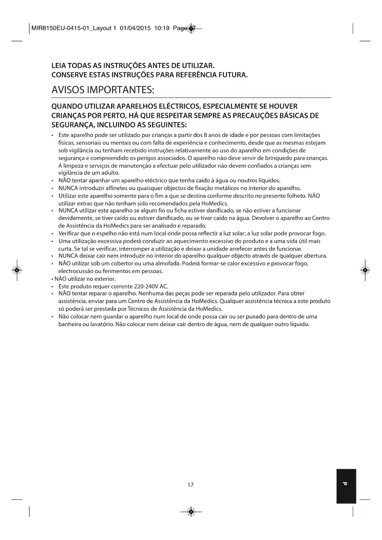 - Não colocar nem guardar o aparelho num local de onde possa cair ou ser puxado para dentro de uma banheira ou lavatório. Não colocar nem deixar cair dentro de água, nem de qualquer outro líquido. MIR8150EU-0415-01_Layout 1 01/04/2015 10:19 Page 1718