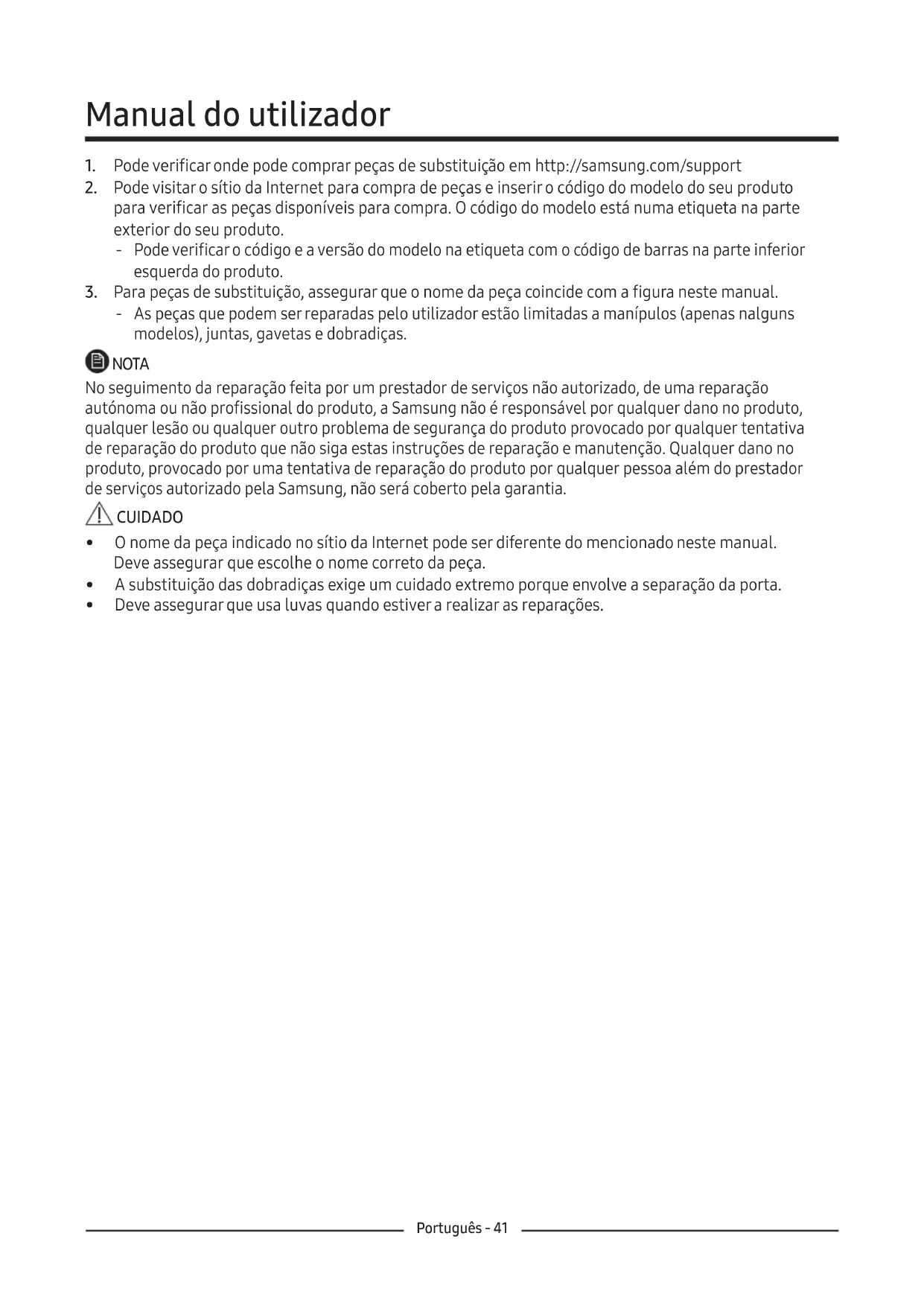 ‐ As peças que podem ser reparadas pelo utilizador estão limitadas a manípulos (apenas nalguns modelos), juntas, gavetas e dobradiças. NOTA No seguimento da reparação feita por um prestador de serviços não autorizado, de uma reparação autónoma ou não profissional do produto, a Samsung não é responsável por qualquer dano no produto, qualquer lesão ou qualquer outro problema de segurança do produto provocado por qualquer tentativa de reparação do produto que não siga estas instruções de reparação e manutenção. Qualquer dano no produto, provocado por uma tentativa de reparação do produto por qualquer pessoa além do prestador de serviços autorizado pela Samsung, não será coberto pela garantia. CUIDADO