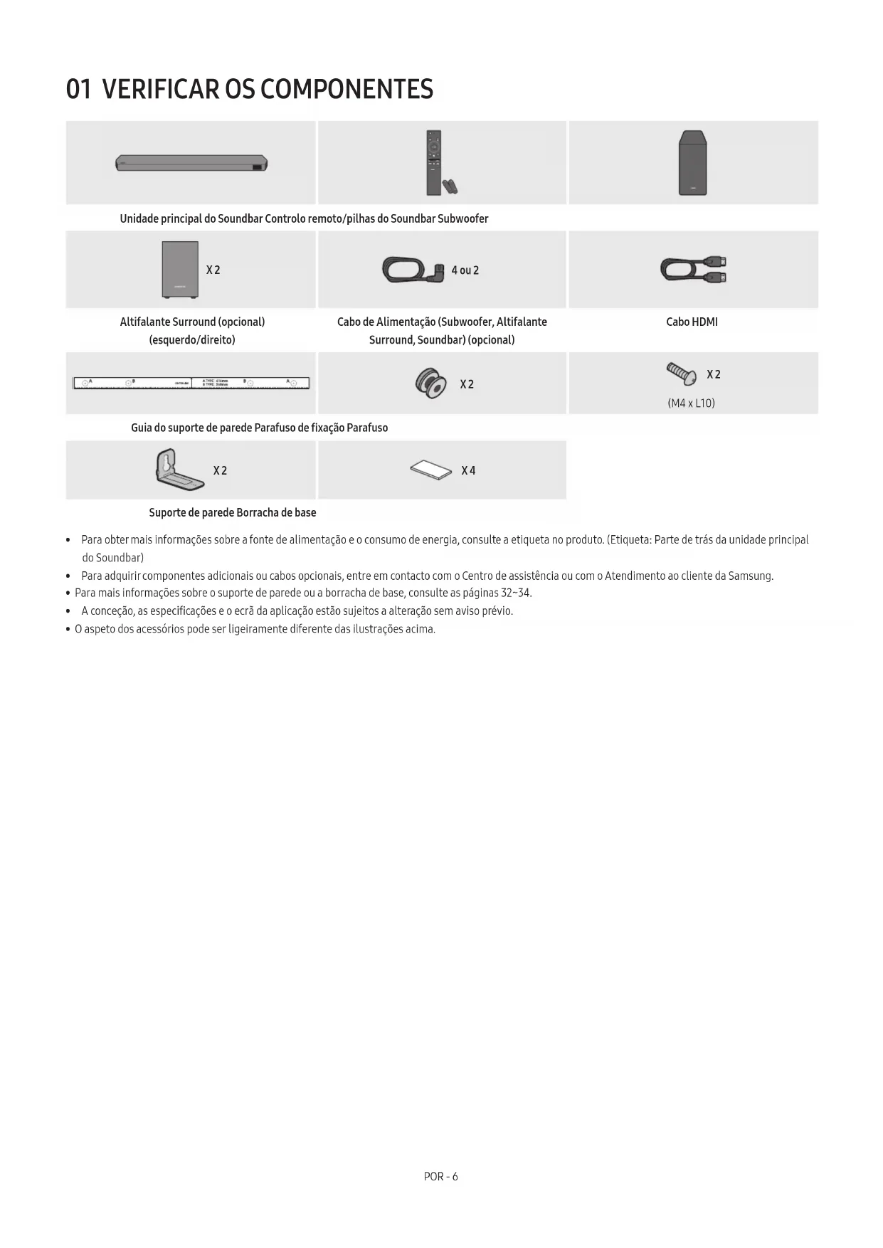 SOUNDBAR Unidade principal do Soundbar Controlo remoto/pilhas do Soundbar Subwoofer POWER X 2 4 ou 2 Altifalante Surround (opcional) (esquerdo/direito) Cabo de Alimentação (Subwoofer, Altifalante Surround, Soundbar) (opcional) Cabo HDMI X 2 X 2 (M4 x L10) Guia do suporte de parede Parafuso de xação Parafuso X 2 X 4 Suporte de parede Borracha de base
