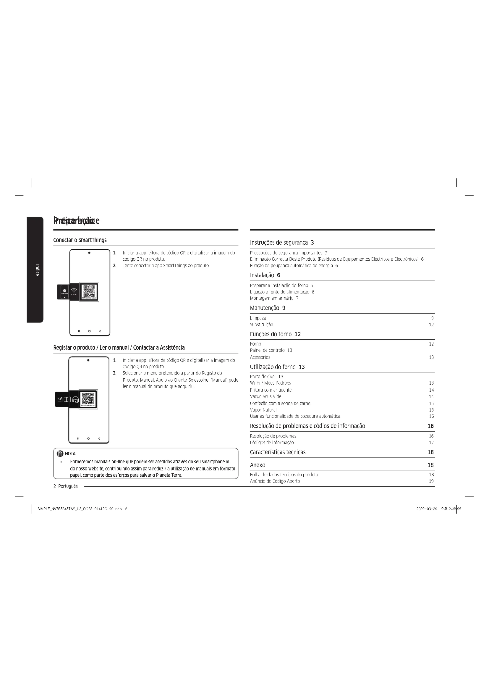 - Para as instruções de como utilizar o produto, consultar os manuais de utilização fornecidos como código QR ou o website da Samsung Electronics (https://www.samsung.com). Digitalize com o seu smartphone. SIMPLE_NV7B5645TAS_U3_DG68-01412C-00.indb 1SIMPLE_NV7B5645TAS_U3_DG68-01412C-00.indb 1 2022-03-29 오후 2:08:582022-03-29 오후 2:08:582 Português Índice Índice Índice Instruções de segurança 3 Precauções de segurança importantes 3 Eliminação Correcta Deste Produto (Resíduos de Equipamentos Eléctricos e Electrónicos) 6 Função de poupança automática de energia 6 Instalação 6 Preparar a instalação do forno 6 Ligação à fonte de alimentação 6 Montagem em armário 7 Manutenção 9 Limpeza 9 Substituição 12 Funções do forno 12 Forno 12 Painel de controlo 13 Acessórios 13 Utilização do forno 13 Porta exível 13 Wi-Fi / Meus Padrões 13 Fritura com ar quente 14 Vácuo Sous Vide 14 Confeção com a sonda de carne 15 Vapor Natural 15 Usar as funcionalidade de cozedura automática 16 Resolução de problemas e códios de informação 16 Resolução de problemas 16 Códigos de informação 17 Características técnicas 18 Anexo 18 Folha de dados técnicos do produto 18 Anúncio de Código Aberto 19 Preparação Conectar o SmartThings