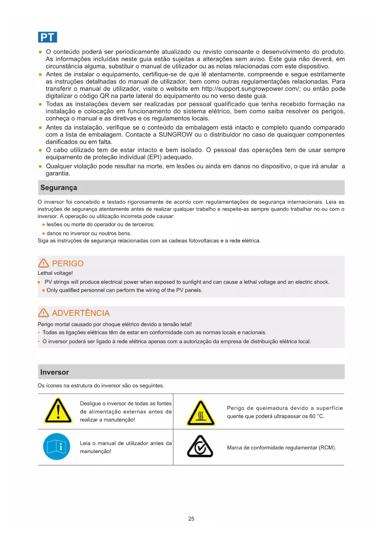 ● O conteúdo poderá ser periodicamente atualizado ou revisto consoante o desenvolvimento do produto. As informações incluídas neste guia estão sujeitas a alterações sem aviso. Este guia não deverá, em circunstância alguma, substituir o manual de utilizador ou as notas relacionadas com este dispositivo. ● Antes de instalar o equipamento, certique-se de que lê atentamente, compreende e segue estritamente as instruções detalhadas do manual de utilizador, bem como outras regulamentações relacionadas. Para transferir o manual de utilizador, visite o website em http://support.sungrowpower.com/; ou então pode digitalizar o código QR na parte lateral do equipamento ou no verso deste guia. ● Todas as instalações devem ser realizadas por pessoal qualificado que tenha recebido formação na instalação e colocação em funcionamento do sistema elétrico, bem como saiba resolver os perigos, conheça o manual e as diretivas e os regulamentos locais. ● Antes da instalação, verique se o conteúdo da embalagem está intacto e completo quando comparado com a lista de embalagem. Contacte a SUNGROW ou o distribuidor no caso de quaisquer componentes danicados ou em falta. ● O cabo utilizado tem de estar intacto e bem isolado. O pessoal das operações tem de usar sempre equipamento de proteção individual (EPI) adequado. ● Qualquer violação pode resultar na morte, em lesões ou ainda em danos no dispositivo, o que irá anular a garantia. Segurança O inversor foi concebido e testado rigorosamente de acordo com regulamentações de segurança internacionais. Leia as instruções de segurança atentamente antes de realizar qualquer trabalho e respeite-as sempre quando trabalhar no ou com o inversor. A operação ou utilização incorreta pode causar: ● lesões ou morte do operador ou de terceiros; ● danos no inversor ou noutros bens. Siga as instruções de segurança relacionadas com as cadeias fotovoltaicas e a rede elétrica. PERIGO Lethal voltage! ● PV strings will produce electrical power when exposed to sunlight and can cause a lethal voltage and an electric shock. ● Only qualied personnel can perform the wiring of the PV panels. ADVERTÊNCIA Perigo mortal causado por choque elétrico devido a tensão letal!