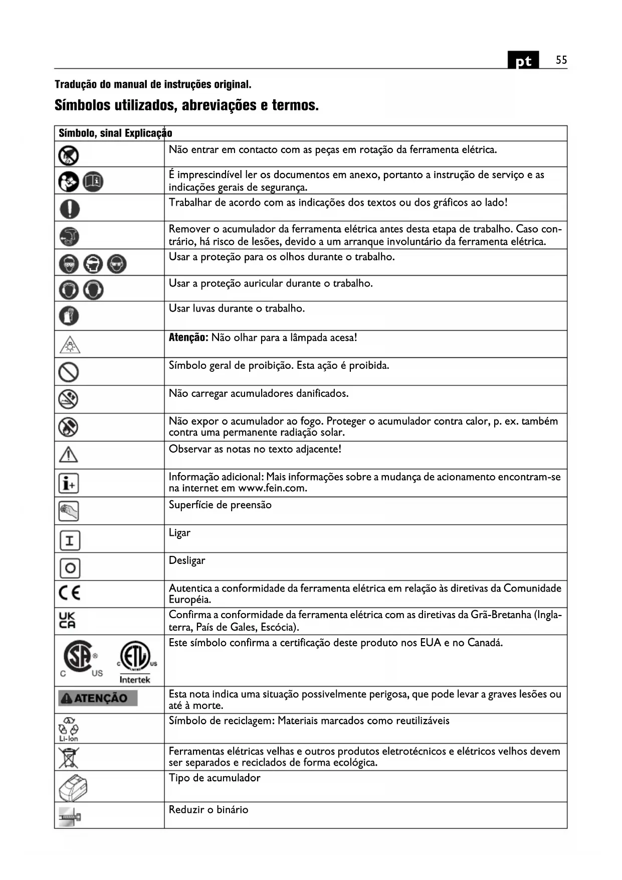 Tradução do manual de instruções original. Símbolos utilizados, abreviações e termos. Símbolo, sinal Explicação Não entrar em contacto com as peças em rotação da ferramenta elétrica. É imprescindível ler os documentos em anexo, portanto a instrução de serviço e as indicações gerais de segurança. Trabalhar de acordo com as indicações dos textos ou dos gráficos ao lado! Remover o acumulador da ferramenta elétrica antes desta etapa de trabalho. Caso con- trário, há risco de lesões, devido a um arranque involuntário da ferramenta elétrica. Usar a proteção para os olhos durante o trabalho. Usar a proteção auricular durante o trabalho. Usar luvas durante o trabalho. Atenção: Não olhar para a lâmpada acesa! Símbolo geral de proibição. Esta ação é proibida. Não carregar acumuladores danificados. Não expor o acumulador ao fogo. Proteger o acumulador contra calor, p. ex. também contra uma permanente radiação solar. Observar as notas no texto adjacente! Informação adicional: Mais informações sobre a mudança de acionamento encontram-se na internet em www.fein.com. Superfície de preensão Ligar Desligar Autentica a conformidade da ferramenta elétrica em relação às diretivas da Comunidade Européia. Confirma a conformidade da ferramenta elétrica com as diretivas da Grã-Bretanha (Ingla- terra, País de Gales, Escócia). Este símbolo confirma a certificação deste produto nos EUA e no Canadá. Esta nota indica uma situação possivelmente perigosa, que pode levar a graves lesões ou até à morte. Símbolo de reciclagem: Materiais marcados como reutilizáveis Ferramentas elétricas velhas e outros produtos eletrotécnicos e elétricos velhos devem ser separados e reciclados de forma ecológica. Tipo de acumulador Reduzir o binário56