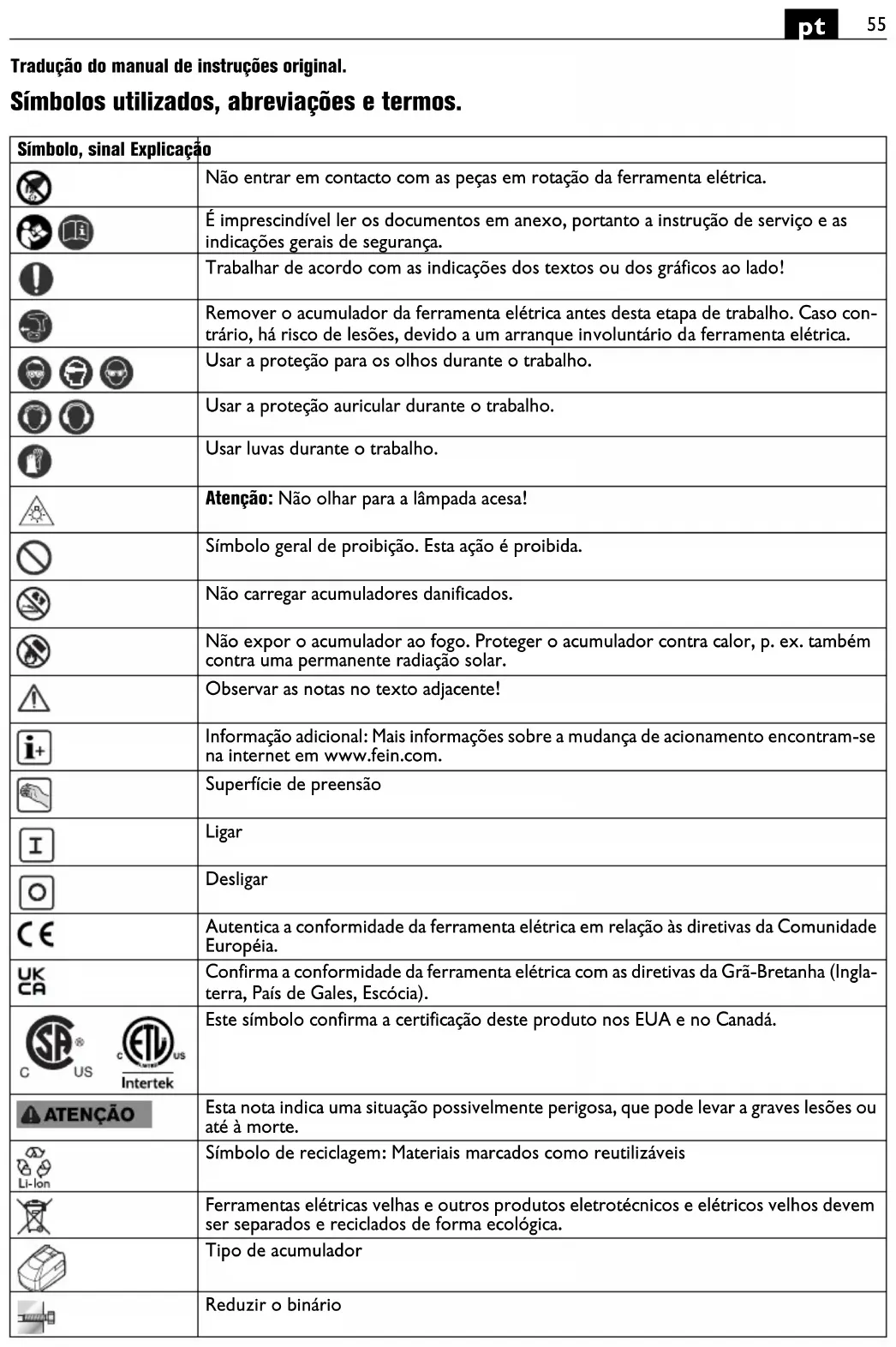 Tradução do manual de instruções original. Símbolos utilizados, abreviações e termos. Símbolo, sinal Explicação Não entrar em contacto com as peças em rotação da ferramenta elétrica. É imprescindível ler os documentos em anexo, portanto a instrução de serviço e as indicações gerais de segurança. Trabalhar de acordo com as indicações dos textos ou dos gráficos ao lado! Remover o acumulador da ferramenta elétrica antes desta etapa de trabalho. Caso con- trário, há risco de lesões, devido a um arranque involuntário da ferramenta elétrica. Usar a proteção para os olhos durante o trabalho. Usar a proteção auricular durante o trabalho. Usar luvas durante o trabalho. Atenção: Não olhar para a lâmpada acesa! Símbolo geral de proibição. Esta ação é proibida. Não carregar acumuladores danificados. Não expor o acumulador ao fogo. Proteger o acumulador contra calor, p. ex. também contra uma permanente radiação solar. Observar as notas no texto adjacente! Informação adicional: Mais informações sobre a mudança de acionamento encontram-se na internet em www.fein.com. Superfície de preensão Ligar Desligar Autentica a conformidade da ferramenta elétrica em relação às diretivas da Comunidade Européia. Confirma a conformidade da ferramenta elétrica com as diretivas da Grã-Bretanha (Ingla- terra, País de Gales, Escócia). Este símbolo confirma a certificação deste produto nos EUA e no Canadá. Esta nota indica uma situação possivelmente perigosa, que pode levar a graves lesões ou até à morte. Símbolo de reciclagem: Materiais marcados como reutilizáveis Ferramentas elétricas velhas e outros produtos eletrotécnicos e elétricos velhos devem ser separados e reciclados de forma ecológica. Tipo de acumulador Reduzir o binário56