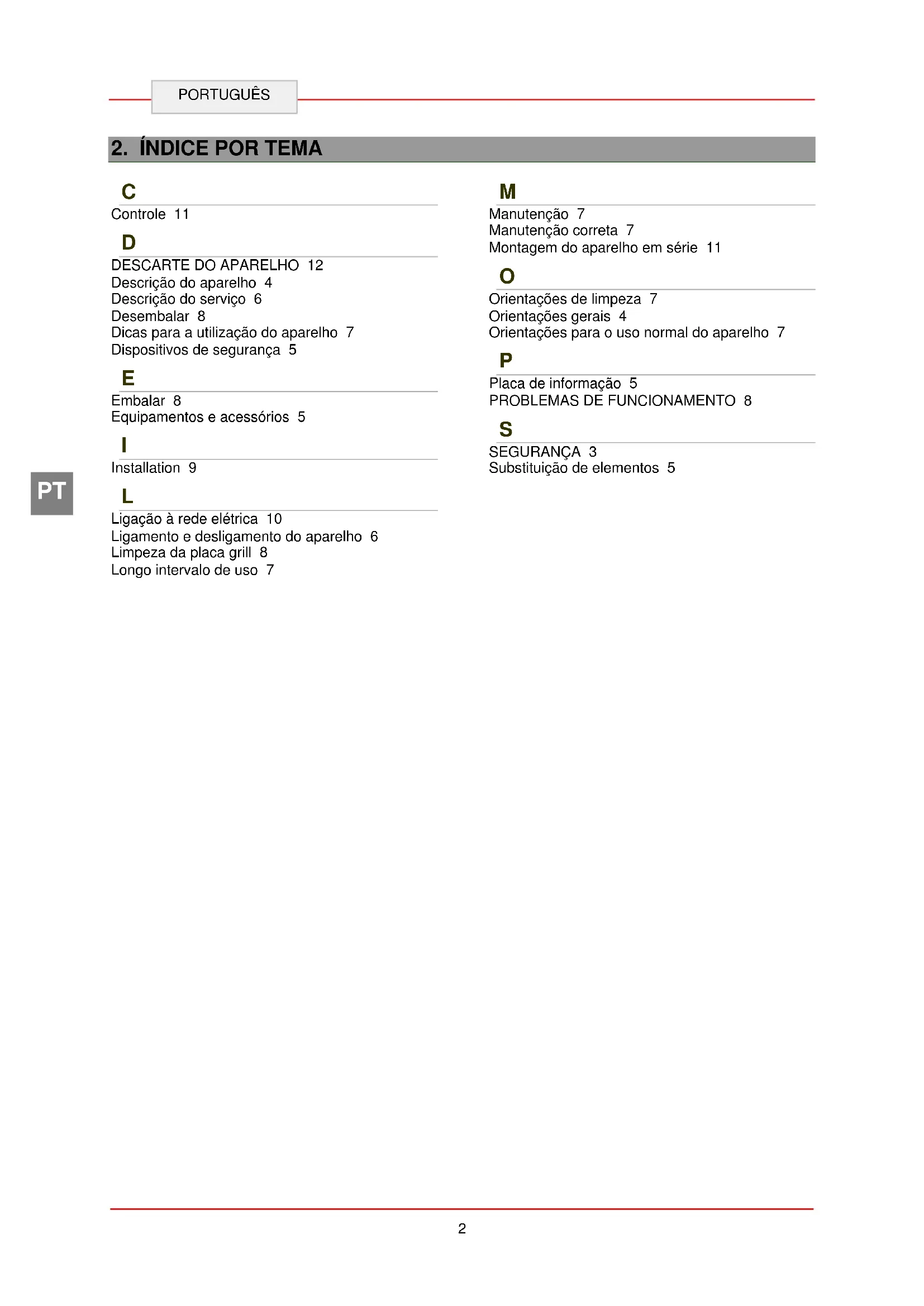 Ligação à rede elétrica 10 Ligamento e desligamento do aparelho 6 Limpeza da placa grill 8 Longo intervalo de uso 7