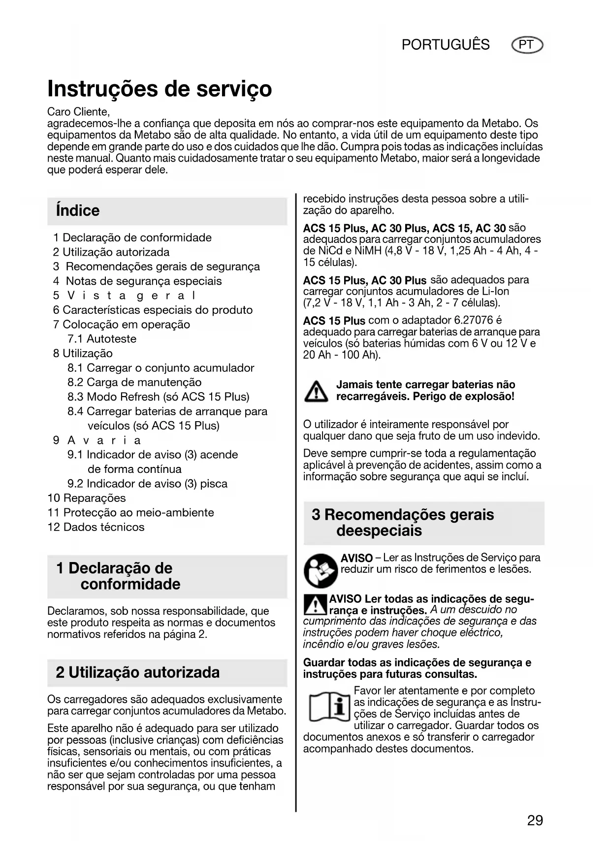 10 Reparações 11 Protecção ao meio-ambiente 12 Dados técnicos Declaramos, sob nossa responsabilidade, que este produto respeita as normas e documentos normativos referidos na página 2. Os carregadores são adequados exclusivamente para carregar conjuntos acumuladores da Metabo. Este aparelho não é adequado para ser utilizado por pessoas (inclusive crianças) com deficiências físicas, sensoriais ou mentais, ou com práticas insuficientes e/ou conhecimentos insuficientes, a não ser que sejam controladas por uma pessoa responsável por sua segurança, ou que tenham recebido instruções desta pessoa sobre a utili- zação do aparelho. ACS 15 Plus, AC 30 Plus, ACS 15, AC 30 são adequados para carregar conjuntos acumuladores de NiCd e NiMH (4,8 V - 18 V, 1,25 Ah - 4 Ah, 4 - 15 células). ACS 15 Plus, AC 30 Plus são adequados para carregar conjuntos acumuladores de Li-Ion (7,2 V - 18 V, 1,1 Ah - 3 Ah, 2 - 7 células). ACS 15 Plus com o adaptador 6.27076 é adequado para carregar baterias de arranque para veículos (só baterias húmidas com 6 V ou 12 V e 20 Ah - 100 Ah). Jamais tente carregar baterias não recarregáveis. Perigo de explosão! O utilizador é inteiramente responsável por qualquer dano que seja fruto de um uso indevido. Deve sempre cumprir-se toda a regulamentação aplicável à prevenção de acidentes, assim como a informação sobre segurança que aqui se incluí. AVISO – Ler as Instruções de Serviço para reduzir um risco de ferimentos e lesões. AVISO Ler todas as indicações de segu- rança e instruções. A um descuido no cumprimento das indicações de segurança e das instruções podem haver choque eléctrico, incêndio e/ou graves lesões. Guardar todas as indicações de segurança e instruções para futuras consultas. Favor ler atentamente e por completo as indicações de segurança e as Instru- ções de Serviço incluídas antes de utilizar o carregador. Guardar todos os documentos anexos e só transferir o carregador acompanhado destes documentos. Instruções de serviço Caro Cliente, agradecemos-lhe a confiança que deposita em nós ao comprar-nos este equipamento da Metabo. Os equipamentos da Metabo são de alta qualidade. No entanto, a vida útil de um equipamento deste tipo depende em grande parte do uso e dos cuidados que lhe dão. Cumpra pois todas as indicações incluídas neste manual. Quanto mais cuidadosamente tratar o seu equipamento Metabo, maior será a longevidade que poderá esperar dele. Índice 1 Declaração de conformidade 2 Utilização autorizada 3 Recomendações gerais deespeciais 17024963_0309 ACS 15 AC 30.book Seite 29 Mittwoch, 4. März 2009 4:29 1630 PORTUGUÊS