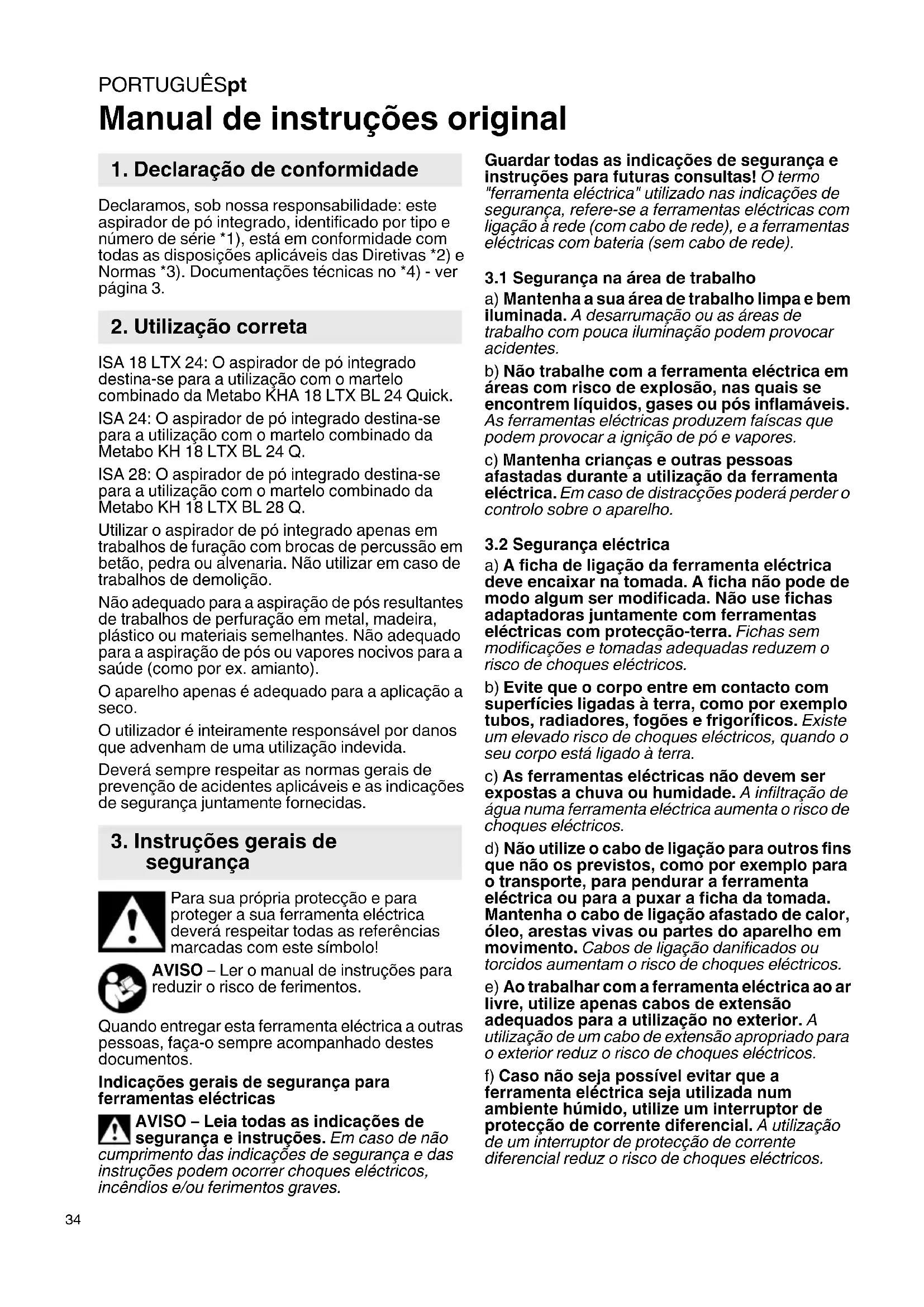 Manual de instruções original Declaramos, sob nossa responsabilidade: este aspirador de pó integrado, identificado por tipo e número de série *1), está em conformidade com todas as disposições aplicáveis das Diretivas *2) e Normas *3). Documentações técnicas no *4) - ver página 3. ISA 18 LTX 24: O aspirador de pó integrado destina-se para a utilização com o martelo combinado da Metabo KHA 18 LTX BL 24 Quick. ISA 24: O aspirador de pó integrado destina-se para a utilização com o martelo combinado da Metabo KH 18 LTX BL 24 Q. ISA 28: O aspirador de pó integrado destina-se para a utilização com o martelo combinado da Metabo KH 18 LTX BL 28 Q. Utilizar o aspirador de pó integrado apenas em trabalhos de furação com brocas de percussão em betão, pedra ou alvenaria. Não utilizar em caso de trabalhos de demolição. Não adequado para a aspiração de pós resultantes de trabalhos de perfuração em metal, madeira, plástico ou materiais semelhantes. Não adequado para a aspiração de pós ou vapores nocivos para a saúde (como por ex. amianto). O aparelho apenas é adequado para a aplicação a seco. O utilizador é inteiramente responsável por danos que advenham de uma utilização indevida. Deverá sempre respeitar as normas gerais de prevenção de acidentes aplicáveis e as indicações de segurança juntamente fornecidas. Para sua própria protecção e para proteger a sua ferramenta eléctrica deverá respeitar todas as referências marcadas com este símbolo! AVISO – Ler o manual de instruções para reduzir o risco de ferimentos. Quando entregar esta ferramenta eléctrica a outras pessoas, faça-o sempre acompanhado destes documentos. Indicações gerais de segurança para ferramentas eléctricas AVISO – Leia todas as indicações de segurança e instruções. Em caso de não cumprimento das indicações de segurança e das instruções podem ocorrer choques eléctricos, incêndios e/ou ferimentos graves. Guardar todas as indicações de segurança e instruções para futuras consultas! O termo "ferramenta eléctrica" utilizado nas indicações de segurança, refere-se a ferramentas eléctricas com ligação à rede (com cabo de rede), e a ferramentas eléctricas com bateria (sem cabo de rede).