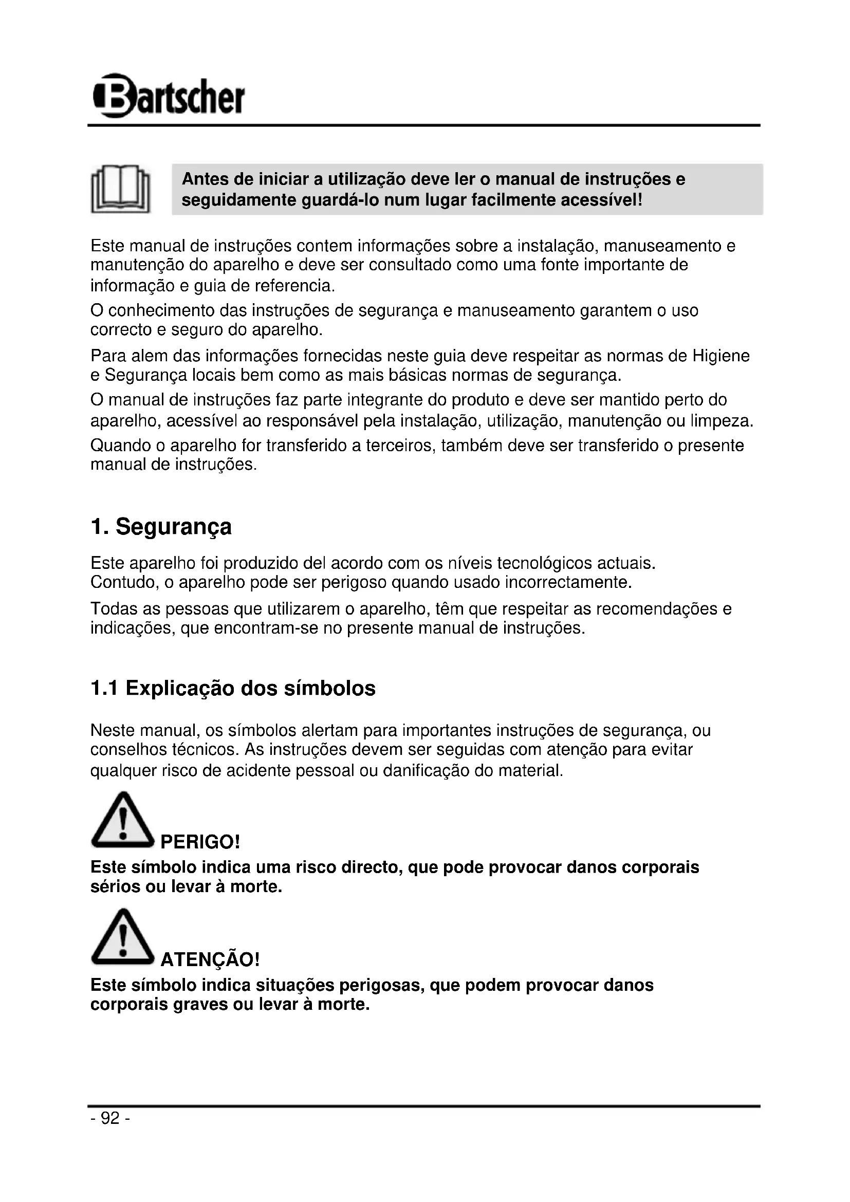 Neste manual, os símbolos alertam para importantes instruções de segurança, ou conselhos técnicos. As instruções devem ser seguidas com atenção para evitar qualquer risco de acidente pessoal ou danificação do material. PERIGO! Este símbolo indica uma risco directo, que pode provocar danos corporais sérios ou levar à morte. ATENÇÃO! Este símbolo indica situações perigosas, que podem provocar danos corporais graves ou levar à morte.- 93 -