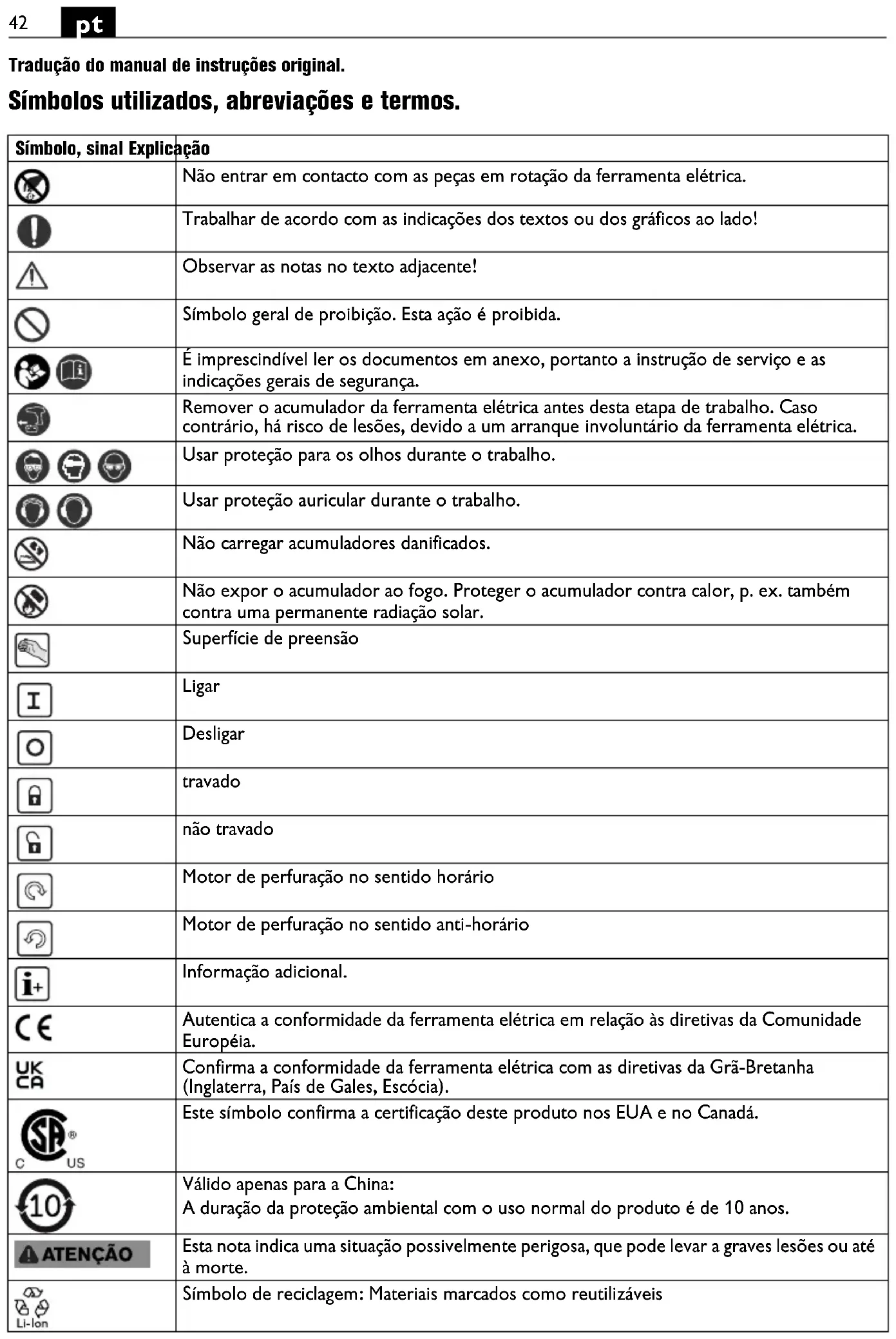 Tradução do manual de instruções original. Símbolos utilizados, abreviações e termos. Símbolo, sinal Explicação Não entrar em contacto com as peças em rotação da ferramenta elétrica. Trabalhar de acordo com as indicações dos textos ou dos gráficos ao lado! Observar as notas no texto adjacente! Símbolo geral de proibição. Esta ação é proibida. É imprescindível ler os documentos em anexo, portanto a instrução de serviço e as indicações gerais de segurança. Remover o acumulador da ferramenta elétrica antes desta etapa de trabalho. Caso contrário, há risco de lesões, devido a um arranque involuntário da ferramenta elétrica. Usar proteção para os olhos durante o trabalho. Usar proteção auricular durante o trabalho. Não carregar acumuladores danificados. Não expor o acumulador ao fogo. Proteger o acumulador contra calor, p. ex. também contra uma permanente radiação solar. Superfície de preensão Ligar Desligar travado não travado Motor de perfuração no sentido horário Motor de perfuração no sentido anti-horário Informação adicional. Autentica a conformidade da ferramenta elétrica em relação às diretivas da Comunidade Européia. Confirma a conformidade da ferramenta elétrica com as diretivas da Grã-Bretanha (Inglaterra, País de Gales, Escócia). Este símbolo confirma a certificação deste produto nos EUA e no Canadá. Válido apenas para a China: A duração da proteção ambiental com o uso normal do produto é de 10 anos. Esta nota indica uma situação possivelmente perigosa, que pode levar a graves lesões ou até à morte. Símbolo de reciclagem: Materiais marcados como reutilizáveis43