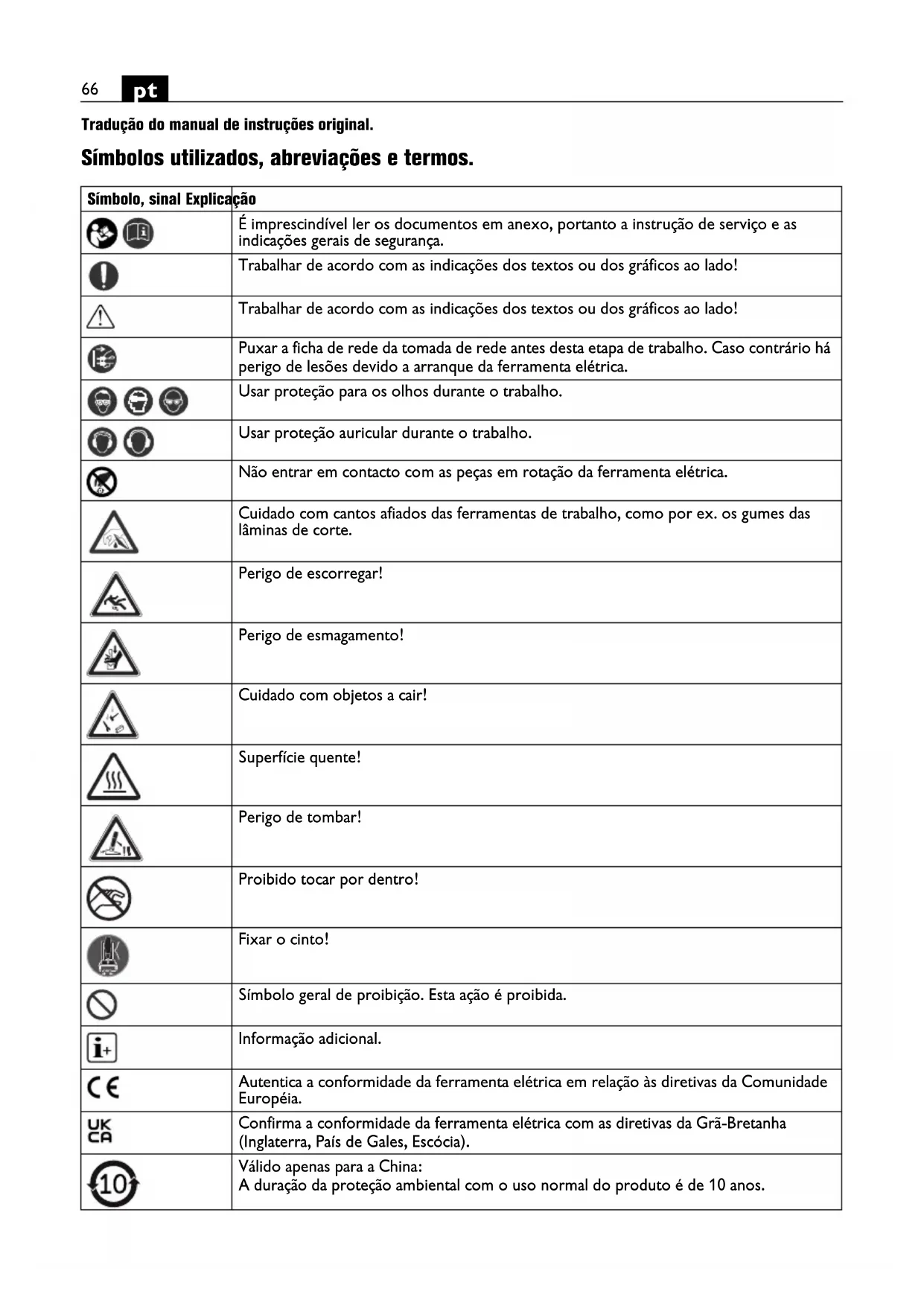 Tradução do manual de instruções original. Símbolos utilizados, abreviações e termos. Símbolo, sinal Explicação É imprescindível ler os documentos em anexo, portanto a instrução de serviço e as indicações gerais de segurança. Trabalhar de acordo com as indicações dos textos ou dos gráficos ao lado! Trabalhar de acordo com as indicações dos textos ou dos gráficos ao lado! Puxar a ficha de rede da tomada de rede antes desta etapa de trabalho. Caso contrário há perigo de lesões devido a arranque da ferramenta elétrica. Usar proteção para os olhos durante o trabalho. Usar proteção auricular durante o trabalho. Não entrar em contacto com as peças em rotação da ferramenta elétrica. Cuidado com cantos afiados das ferramentas de trabalho, como por ex. os gumes das lâminas de corte. Perigo de escorregar! Perigo de esmagamento! Cuidado com objetos a cair! Superfície quente! Perigo de tombar! Proibido tocar por dentro! Fixar o cinto! Símbolo geral de proibição. Esta ação é proibida. Informação adicional. Autentica a conformidade da ferramenta elétrica em relação às diretivas da Comunidade Européia. Confirma a conformidade da ferramenta elétrica com as diretivas da Grã-Bretanha (Inglaterra, País de Gales, Escócia). Válido apenas para a China: A duração da proteção ambiental com o uso normal do produto é de 10 anos.67