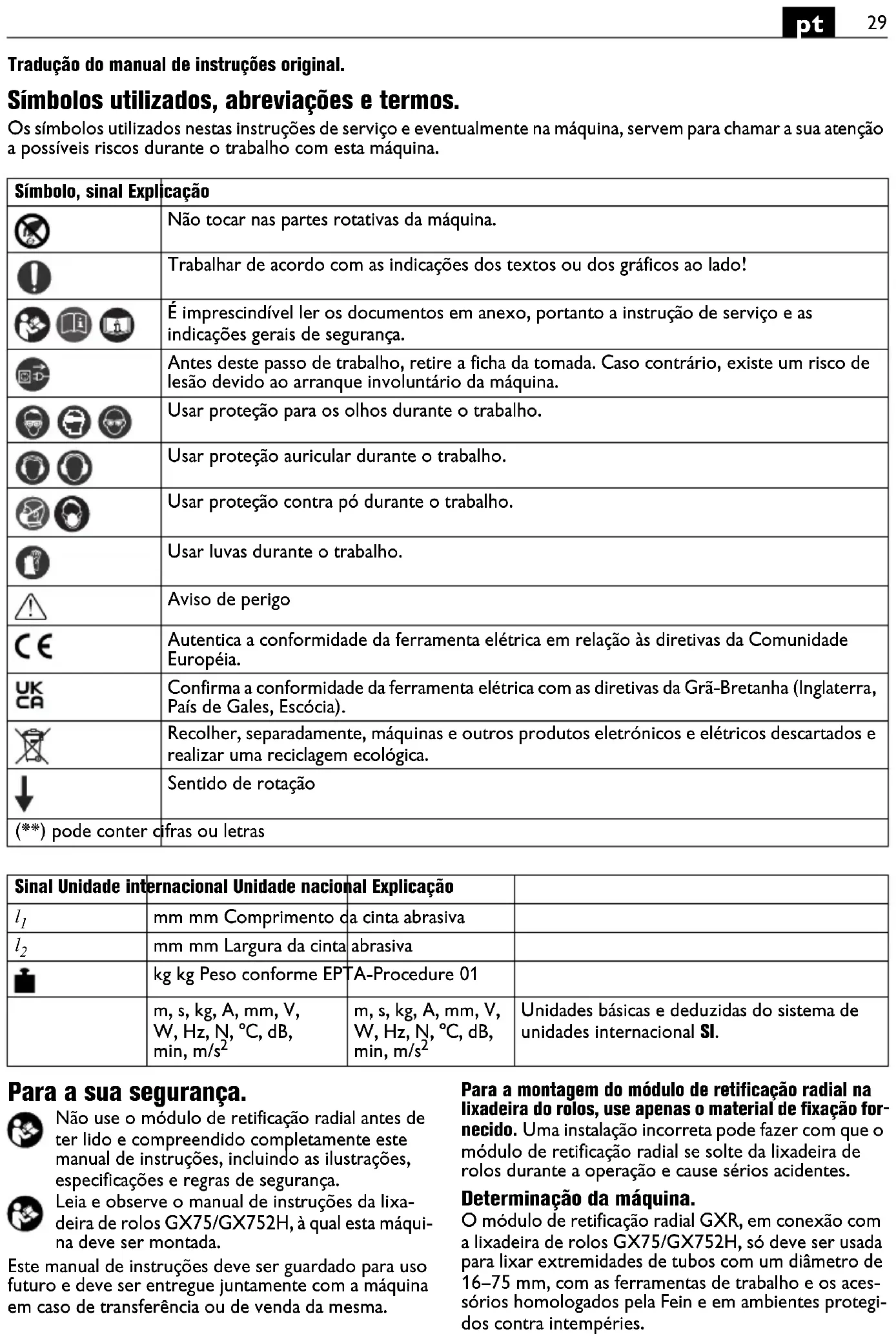 Os sintolosutiladosnestas instruçõesde service e eventualmente na maquina, servem para chamar a sua atenço a possiveis ricos durante o trabalho com esta maquina.