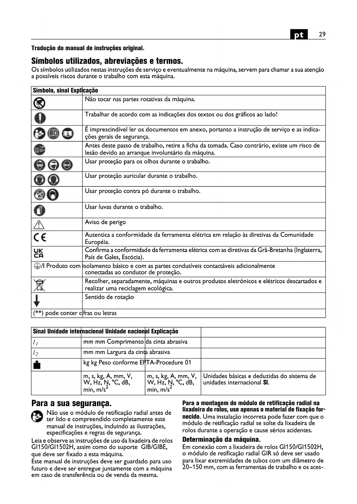Leia e observe as instruções de uso da lixadeira de rolos GI150/GI1502H, assim como do suporte GIB/GIBE, que deve ser fixado a esta boa.
