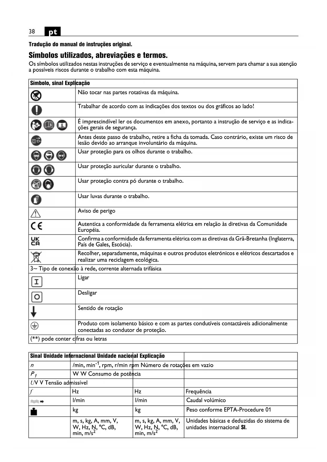 Tradução do manual de instruções original. Símbolos utilizados, abreviações e termos. Os símbolos utilizados nestas instruções de serviço e eventualmente na máquina, servem para chamar a sua atenção a possíveis riscos durante o trabalho com esta máquina. Símbolo, sinal Explicação Não tocar nas partes rotativas da máquina. Trabalhar de acordo com as indicações dos textos ou dos gráficos ao lado! É imprescindível ler os documentos em anexo, portanto a instrução de serviço e as indica- ções gerais de segurança. Antes deste passo de trabalho, retire a ficha da tomada. Caso contrário, existe um risco de lesão devido ao arranque involuntário da máquina. Usar proteção para os olhos durante o trabalho. Usar proteção auricular durante o trabalho. Usar proteção contra pó durante o trabalho. Usar luvas durante o trabalho. Aviso de perigo Autentica a conformidade da ferramenta elétrica em relação às diretivas da Comunidade Européia. Confirma a conformidade da ferramenta elétrica com as diretivas da Grã-Bretanha (Inglaterra, País de Gales, Escócia). Recolher, separadamente, máquinas e outros produtos eletrónicos e elétricos descartados e realizar uma reciclagem ecológica. 3~ Tipo de conexão à rede, corrente alternada trifásica Ligar Desligar Sentido de rotação Produto com isolamento básico e com as partes condutíveis contactáveis adicionalmente conectadas ao condutor de proteção. (**) pode conter cifras ou letras Sinal Unidade internacional Unidade nacional Explicação
