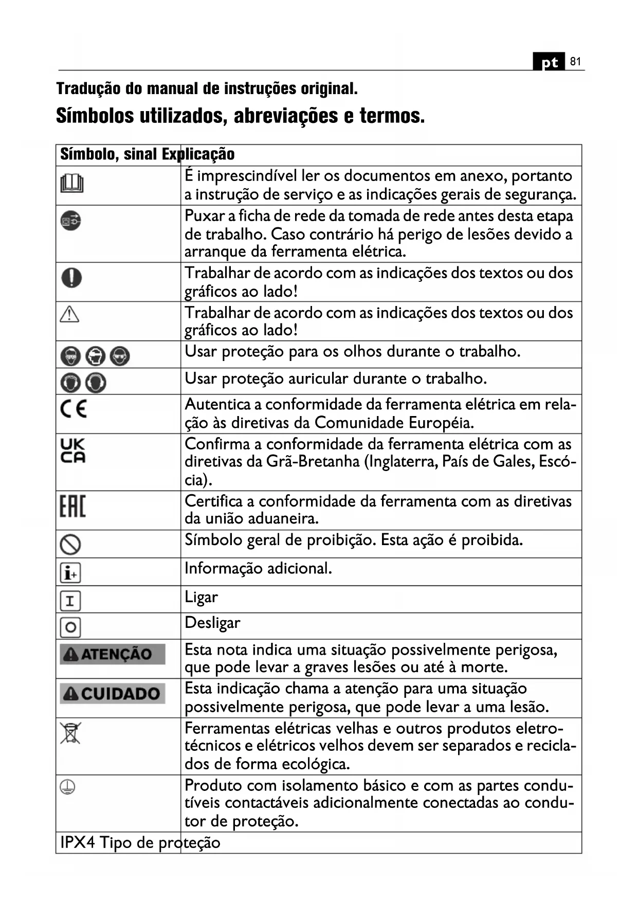 Tradução do manual de instruções original. Símbolos utilizados, abreviações e termos. Símbolo, sinal Explicação É imprescindível ler os documentos em anexo, portanto a instrução de serviço e as indicações gerais de segurança. Puxar a ficha de rede da tomada de rede antes desta etapa de trabalho. Caso contrário há perigo de lesões devido a arranque da ferramenta elétrica. Trabalhar de acordo com as indicações dos textos ou dos gráficos ao lado! Trabalhar de acordo com as indicações dos textos ou dos gráficos ao lado! Usar proteção para os olhos durante o trabalho. Usar proteção auricular durante o trabalho. Autentica a conformidade da ferramenta elétrica em rela- ção às diretivas da Comunidade Européia. Confirma a conformidade da ferramenta elétrica com as diretivas da Grã-Bretanha (Inglaterra, País de Gales, Escó- cia). Certifica a conformidade da ferramenta com as diretivas da união aduaneira. Símbolo geral de proibição. Esta ação é proibida. Informação adicional. Ligar Desligar Esta nota indica uma situação possivelmente perigosa, que pode levar a graves lesões ou até à morte. Esta indicação chama a atenção para uma situação possivelmente perigosa, que pode levar a uma lesão. Ferramentas elétricas velhas e outros produtos eletro- técnicos e elétricos velhos devem ser separados e recicla- dos de forma ecológica. Produto com isolamento básico e com as partes condu- tíveis contactáveis adicionalmente conectadas ao condu- tor de proteção. IPX4 Tipo de proteção82