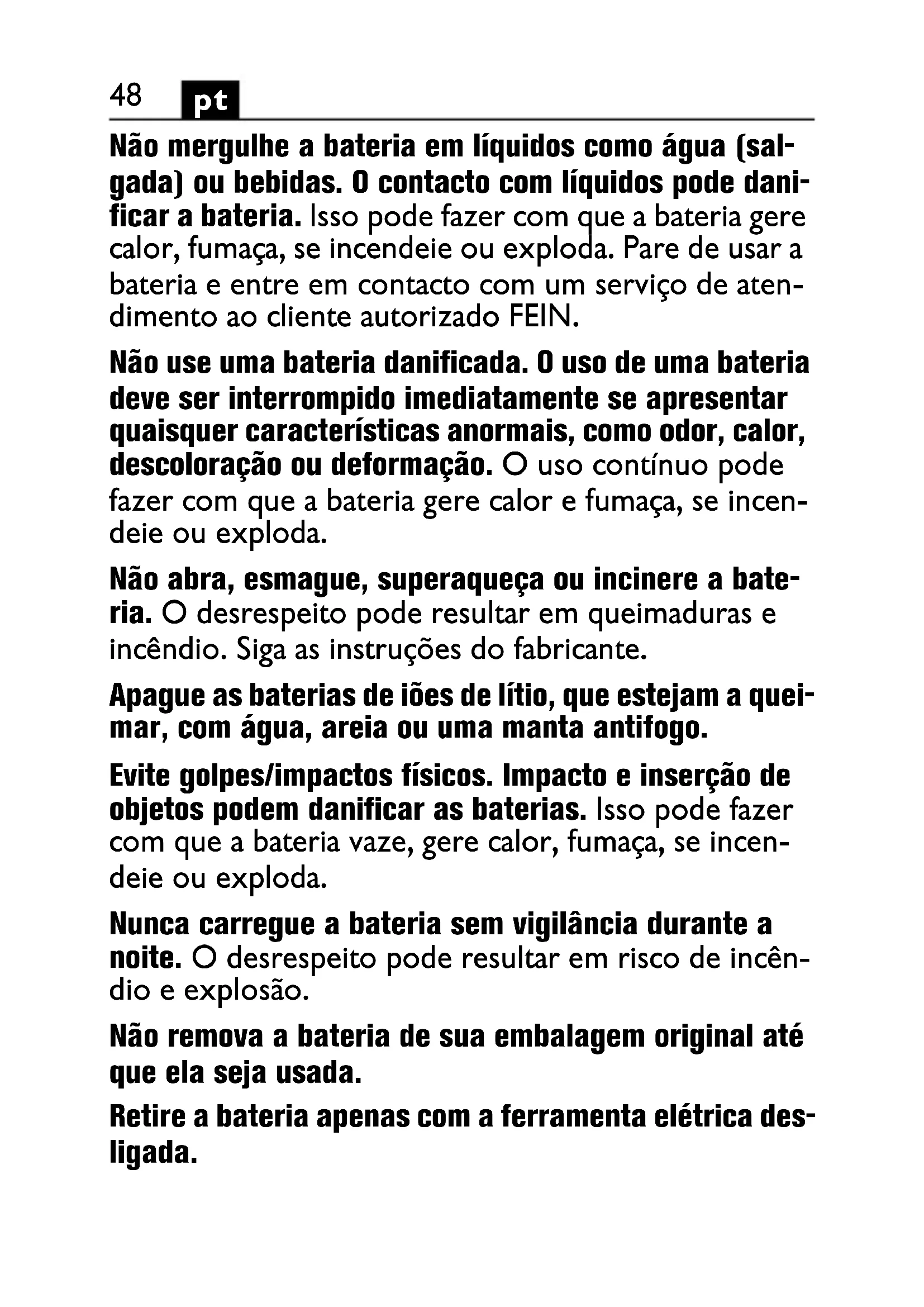 Não mergulhe a bateria em líquidos como água (sal- gada) ou bebidas. O contacto com líquidos pode dani- ficar a bateria. Isso pode fazer com que a bateria gere calor, fumaça, se incendeie ou exploda. Pare de usar a bateria e entre em contacto com um serviço de aten- dimento ao cliente autorizado FEIN. Não use uma bateria danificada. O uso de uma bateria deve ser interrompido imediatamente se apresentar quaisquer características anormais, como odor, calor, descoloração ou deformação. O uso contínuo pode fazer com que a bateria gere calor e fumaça, se incen- deie ou exploda. Não abra, esmague, superaqueça ou incinere a bate- ria. O desrespeito pode resultar em queimaduras e incêndio. Siga as instruções do fabricante. Apague as baterias de iões de lítio, que estejam a quei- mar, com água, areia ou uma manta antifogo. Evite golpes/impactos físicos. Impacto e inserção de objetos podem danificar as baterias. Isso pode fazer com que a bateria vaze, gere calor, fumaça, se incen- deie ou exploda. Nunca carregue a bateria sem vigilância durante a noite. O desrespeito pode resultar em risco de incên- dio e explosão. Não remova a bateria de sua embalagem original até que ela seja usada. Retire a bateria apenas com a ferramenta elétrica des- ligada.49
