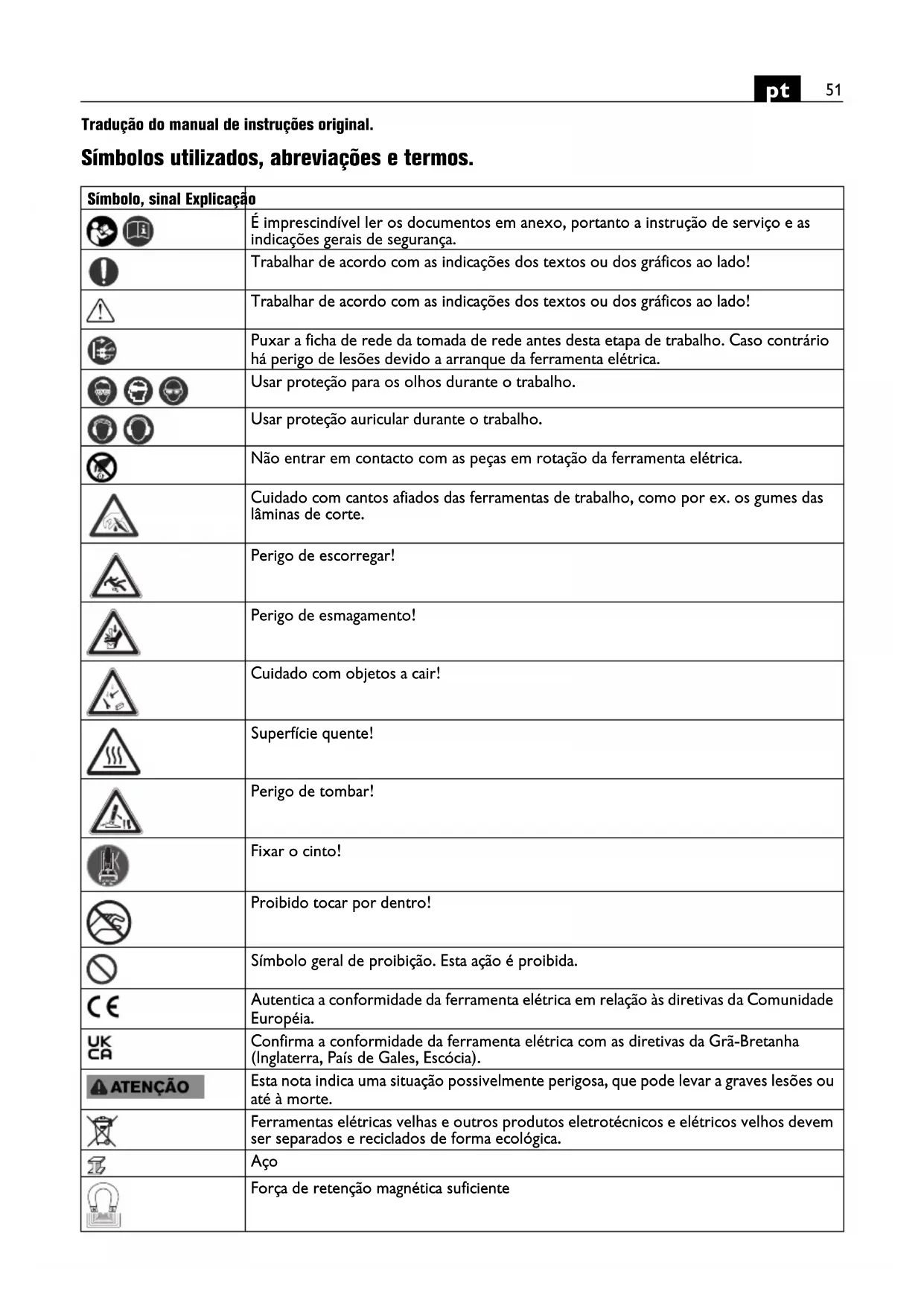 Tradução do manual de instruções original. Símbolos utilizados, abreviações e termos. Símbolo, sinal Explicação É imprescindível ler os documentos em anexo, portanto a instrução de serviço e as indicações gerais de segurança. Trabalhar de acordo com as indicações dos textos ou dos gráficos ao lado! Trabalhar de acordo com as indicações dos textos ou dos gráficos ao lado! Puxar a ficha de rede da tomada de rede antes desta etapa de trabalho. Caso contrário há perigo de lesões devido a arranque da ferramenta elétrica. Usar proteção para os olhos durante o trabalho. Usar proteção auricular durante o trabalho. Não entrar em contacto com as peças em rotação da ferramenta elétrica. Cuidado com cantos afiados das ferramentas de trabalho, como por ex. os gumes das lâminas de corte. Perigo de escorregar! Perigo de esmagamento! Cuidado com objetos a cair! Superfície quente! Perigo de tombar! Fixar o cinto! Proibido tocar por dentro! Símbolo geral de proibição. Esta ação é proibida. Autentica a conformidade da ferramenta elétrica em relação às diretivas da Comunidade Européia. Confirma a conformidade da ferramenta elétrica com as diretivas da Grã-Bretanha (Inglaterra, País de Gales, Escócia). Esta nota indica uma situação possivelmente perigosa, que pode levar a graves lesões ou até à morte. Ferramentas elétricas velhas e outros produtos eletrotécnicos e elétricos velhos devem ser separados e reciclados de forma ecológica. Aço Força de retenção magnética suficiente52