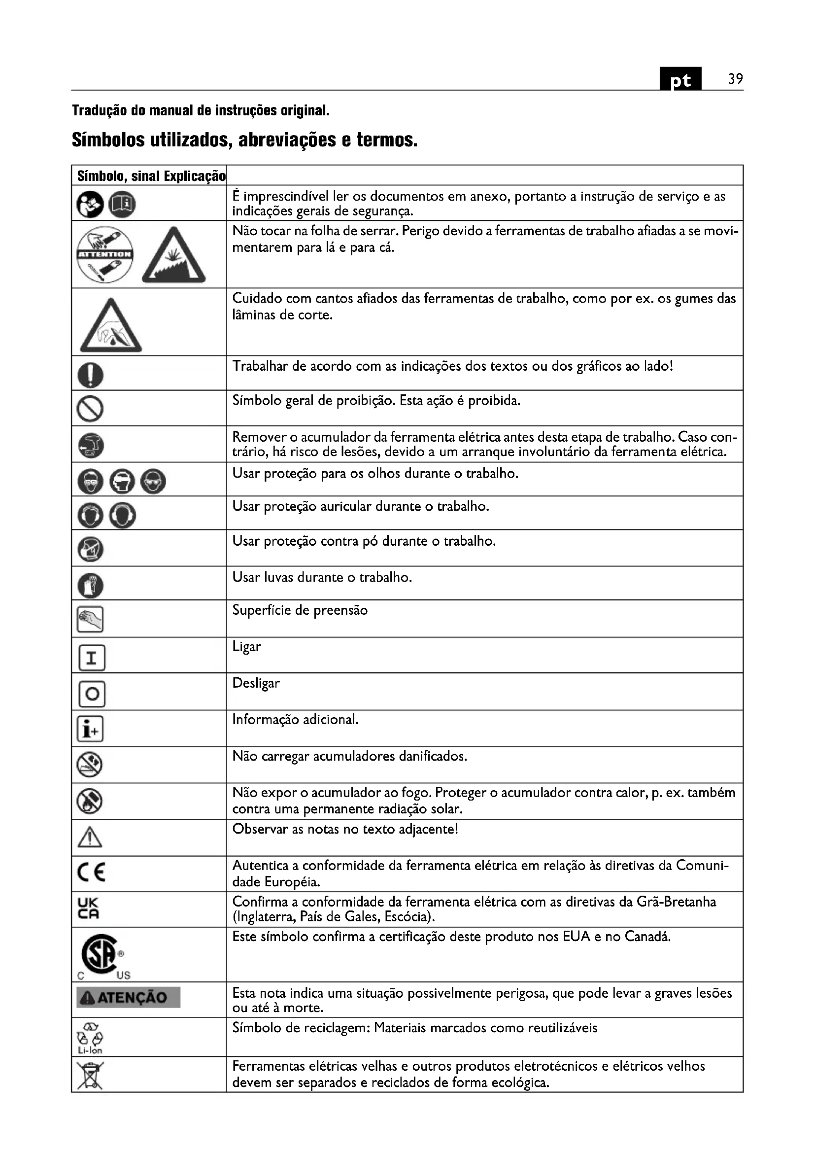 Tradução do manual de instruções original. Símbolos utilizados, abreviações e termos. Símbolo, sinal Explicação É imprescindível ler os documentos em anexo, portanto a instrução de serviço e as indicações gerais de segurança. Não tocar na folha de serrar. Perigo devido a ferramentas de trabalho afiadas a se movi- mentarem para lá e para cá. Cuidado com cantos afiados das ferramentas de trabalho, como por ex. os gumes das lâminas de corte. Trabalhar de acordo com as indicações dos textos ou dos gráficos ao lado! Símbolo geral de proibição. Esta ação é proibida. Remover o acumulador da ferramenta elétrica antes desta etapa de trabalho. Caso con- trário, há risco de lesões, devido a um arranque involuntário da ferramenta elétrica. Usar proteção para os olhos durante o trabalho. Usar proteção auricular durante o trabalho. Usar proteção contra pó durante o trabalho. Usar luvas durante o trabalho. Superfície de preensão Ligar Desligar Informação adicional. Não carregar acumuladores danificados. Não expor o acumulador ao fogo. Proteger o acumulador contra calor, p. ex. também contra uma permanente radiação solar. Observar as notas no texto adjacente! Autentica a conformidade da ferramenta elétrica em relação às diretivas da Comuni- dade Européia. Confirma a conformidade da ferramenta elétrica com as diretivas da Grã-Bretanha (Inglaterra, País de Gales, Escócia). Este símbolo confirma a certificação deste produto nos EUA e no Canadá. Esta nota indica uma situação possivelmente perigosa, que pode levar a graves lesões ou até à morte. Símbolo de reciclagem: Materiais marcados como reutilizáveis Ferramentas elétricas velhas e outros produtos eletrotécnicos e elétricos velhos devem ser separados e reciclados de forma ecológica.40