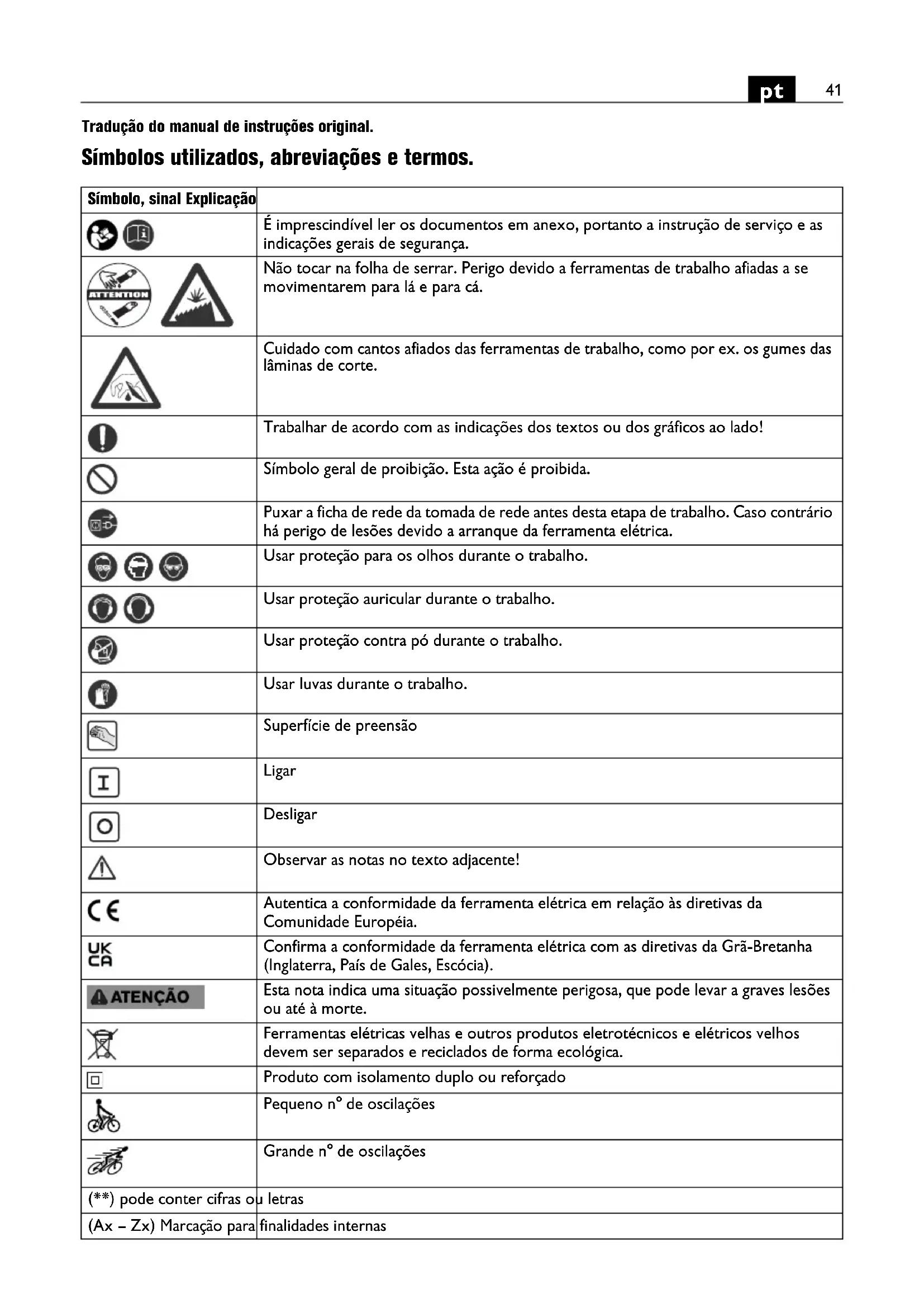 Tradução do manual de instruções original. Símbolos utilizados, abreviações e termos. Símbolo, sinal Explicação É imprescindível ler os documentos em anexo, portanto a instrução de serviço e as indicações gerais de segurança. Não tocar na folha de serrar. Perigo devido a ferramentas de trabalho afiadas a se movimentarem para lá e para cá. Cuidado com cantos afiados das ferramentas de trabalho, como por ex. os gumes das lâminas de corte. Trabalhar de acordo com as indicações dos textos ou dos gráficos ao lado! Símbolo geral de proibição. Esta ação é proibida. Puxar a ficha de rede da tomada de rede antes desta etapa de trabalho. Caso contrário há perigo de lesões devido a arranque da ferramenta elétrica. Usar proteção para os olhos durante o trabalho. Usar proteção auricular durante o trabalho. Usar proteção contra pó durante o trabalho. Usar luvas durante o trabalho. Superfície de preensão Ligar Desligar Observar as notas no texto adjacente! Autentica a conformidade da ferramenta elétrica em relação às diretivas da Comunidade Européia. Confirma a conformidade da ferramenta elétrica com as diretivas da Grã-Bretanha (Inglaterra, País de Gales, Escócia). Esta nota indica uma situação possivelmente perigosa, que pode levar a graves lesões ou até à morte. Ferramentas elétricas velhas e outros produtos eletrotécnicos e elétricos velhos devem ser separados e reciclados de forma ecológica. Produto com isolamento duplo ou reforçado Pequeno n° de oscilações Grande n° de oscilações (**) pode conter cifras ou letras (Ax – Zx) Marcação para finalidades internas42