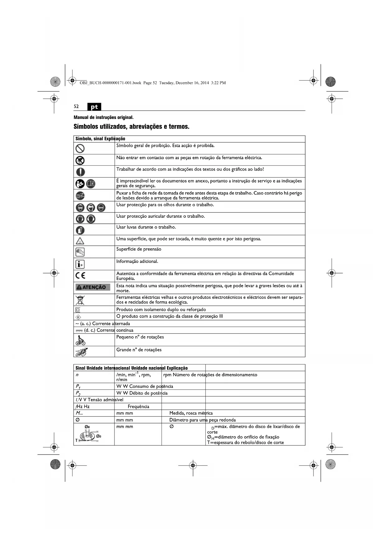 Manual de instruções original. Símbolos utilizados, abreviações e termos. Símbolo, sinal Explicação Símbolo geral de proibição. Esta acção é proibida. Não entrar em contacto com as peças em rotação da ferramenta eléctrica. Trabalhar de acordo com as indicações dos textos ou dos gráficos ao lado! É imprescindível ler os documentos em anexo, portanto a instrução de serviço e as indicações gerais de segurança. Puxar a ficha de rede da tomada de rede antes desta etapa de trabalho. Caso contrário há perigo de lesões devido a arranque da ferramenta eléctrica. Usar protecção para os olhos durante o trabalho. Usar protecção auricular durante o trabalho. Usar luvas durante o trabalho. Uma superfície, que pode ser tocada, é muito quente e por isto perigosa. Superfície de preensão Informação adicional. Autentica a conformidade da ferramenta eléctrica em relação às directivas da Comunidade Européia. Esta nota indica uma situação possivelmente perigosa, que pode levar a graves lesões ou até à morte. Ferramentas eléctricas velhas e outros produtos electrotécnicos e eléctricos devem ser separa- dos e reciclados de forma ecológica. Produto com isolamento duplo ou reforçado O produto com a construção da classe de proteção III ~ (a. c.) Corrente alternada (d. c.) Corrente contínua Pequeno n° de rotações Grande n° de rotações Sinal Unidade internacional Unidade nacional Explicação