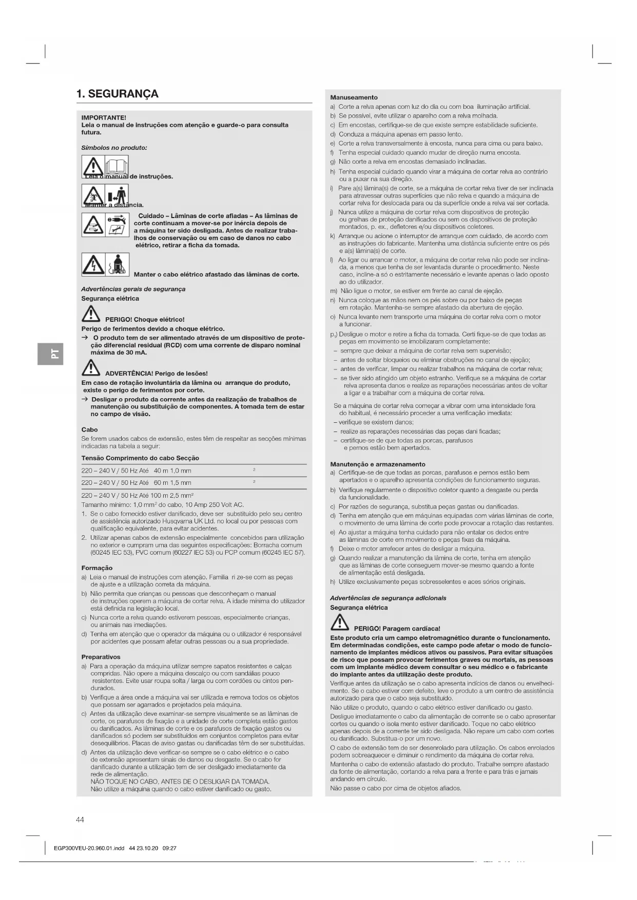 ) Desligue o motor e retire a ficha da tomada. Certi fique-se de que todas as peças em movimento se imobilizaram completamente: – sempre que deixar a máquina de cortar relva sem supervisão; – antes de soltar bloqueios ou eliminar obstruções no canal de ejeção; – antes de verificar, limpar ou realizar trabalhos na máquina de cortar relva; – se tiver sido atingido um objeto estranho. Verifique se a máquina de cortar relva apresenta danos e realize as reparações necessárias antes de voltar a ligar e a trabalhar com a máquina de cortar relva. Se a máquina de cortar relva começar a vibrar com uma intensidade fora do habitual, é necessário proceder a uma verificação imediata: – verifique se existem danos; – realize as reparações necessárias das peças dani ficadas; – certifique-se de que todas as porcas, parafusos e pernos estão bem apertados. Manutenção e armazenamento a) Certifique-se de que todas as porcas, parafusos e pernos estão bem apertados e o aparelho apresenta condições de funcionamento seguras. b) Verifique regularmente o dispositivo coletor quanto a desgaste ou perda da funcionalidade. c) Por razões de segurança, substitua peças gastas ou danificadas. d) Tenha em atenção que em máquinas equipadas com várias lâminas de corte, o movimento de uma lâmina de corte pode provocar a rotação das restantes. e) Ao ajustar a máquina tenha cuidado para não entalar os dedos entre as lâminas de corte em movimento e peças fixas da máquina. f) Deixe o motor arrefecer antes de desligar a máquina. g) Quando realizar a manutenção da lâmina de corte, tenha em atenção que as lâminas de corte conseguem mover-se mesmo quando a fonte de alimentação está desligada. h) Utilize exclusivamente peças sobresselentes e aces sórios originais. Advertências de segurança adicionais Segurança elétrica PERIGO! Paragem cardíaca! Este produto cria um campo eletromagnético durante o funcionamento. Em determinadas condições, este campo pode afetar o modo de funcio- namento de implantes médicos ativos ou passivos. Para evitar situações de risco que possam provocar ferimentos graves ou mortais, as pessoas com um implante médico devem consultar o seu médico e o fabricante do implante antes da utilização deste produto. Verifique antes da utilização se o cabo apresenta indícios de danos ou envelheci- mento. Se o cabo estiver com defeito, leve o produto a um centro de assistência autorizado para que o cabo seja substituído. Não utilize o produto, quando o cabo elétrico estiver danificado ou gasto. Desligue imediatamente o cabo da alimentação de corrente se o cabo apresentar cortes ou quando o isola mento estiver danificado. Toque no cabo elétrico apenas depois de a corrente ter sido desligada. Não repare um cabo com cortes ou danificado. Substitua-o por um novo. O cabo de extensão tem de ser desenrolado para utilização. Os cabos enrolados podem sobreaquecer e diminuir o rendimento da máquina de cortar relva. Mantenha o cabo de extensão afastado do produto. Trabalhe sempre afastado da fonte de alimentação, cortando a relva para a frente e para trás e jamais andando em círculo. Não passe o cabo por cima de objetos afiados. EGP300VEU-20.960.01.indd 44 23.10.20 09:27PT