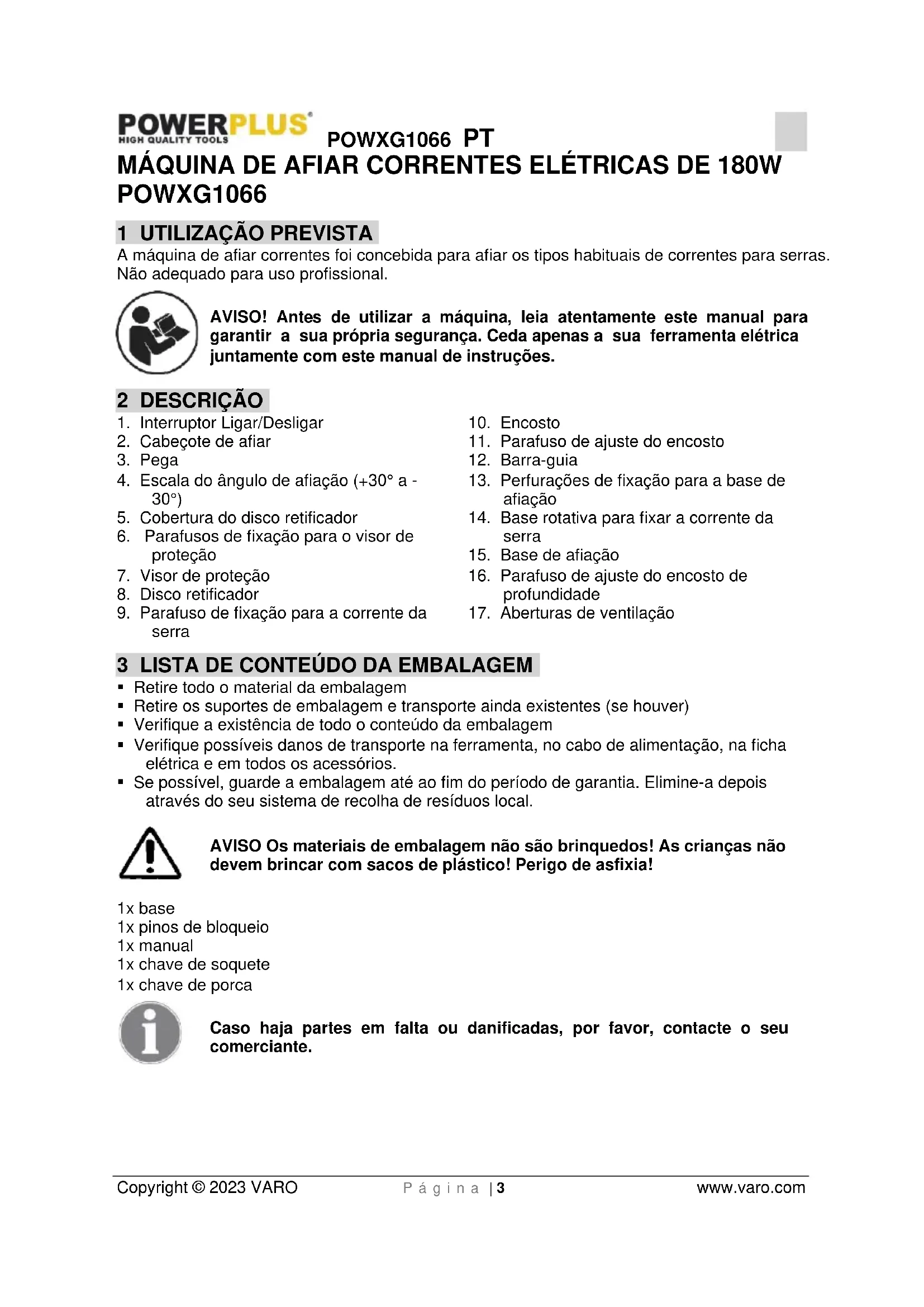 - Não afie elos de acionamento ou de ligação; nesse caso existe o risco de a corrente romper.POWXG1066 PT Copyright © 2023 VARO P á g i n a | 8 www.varo.com