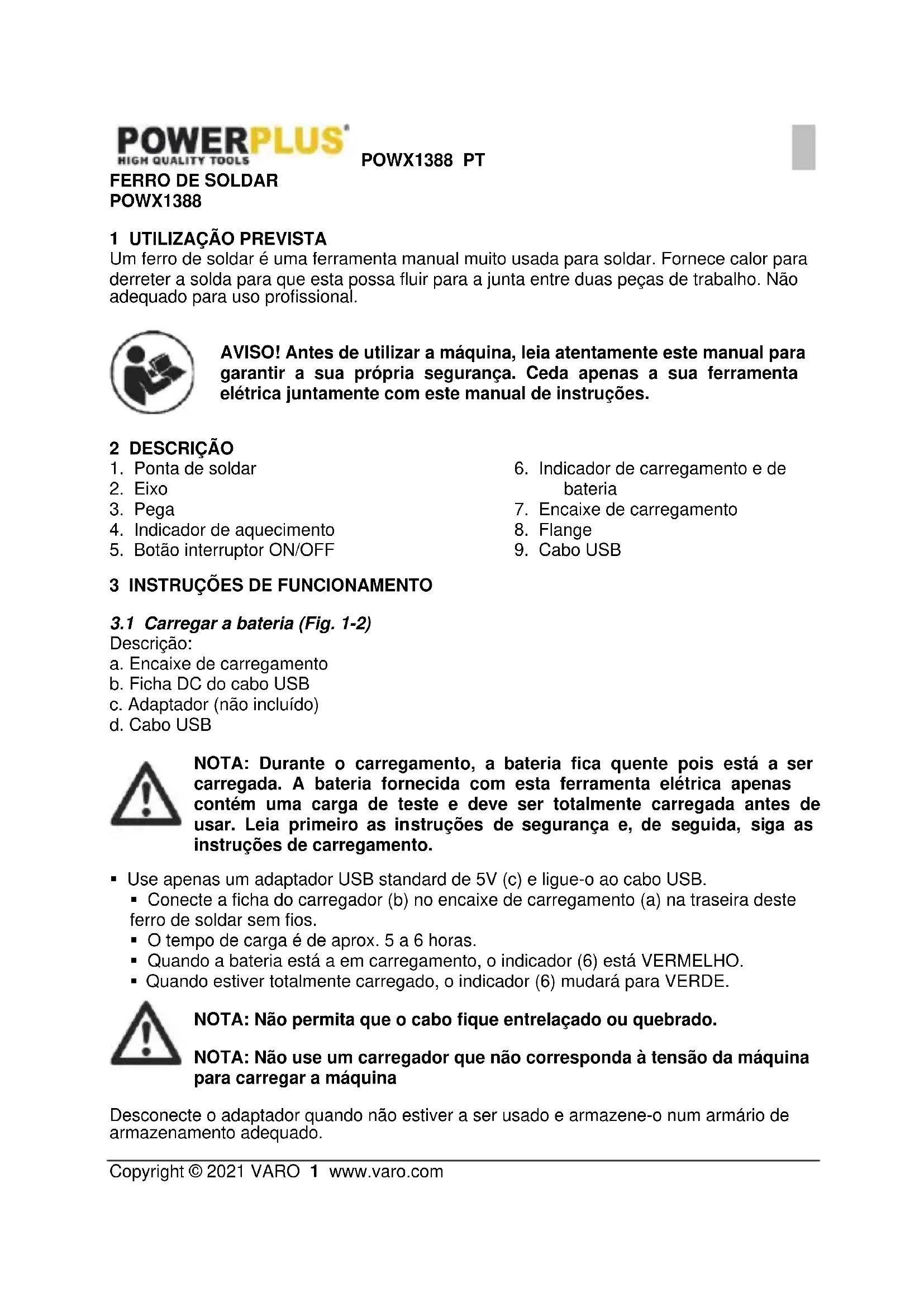 NOTA: esta ferramenta está predefinida no modo de envio para evitar que a bateria descarregue devido à falta de operação e ao risco de incêndio, para que o interruptor não arranque a ferramenta. Antes da primeira utilização, o ferro de soldar tem de ser reativado ao ligar o adaptador à fonte de alimentação, o indicador de carga (6) mostra vermelho, a ferramenta pode ser usada após retirar a ficha do adaptador. Recomenda-se reativar a ferramenta para o modo de envio aquando do transporte e do armazenamento. Prima e segure o botão interruptor (5) 5 a 8 seg., solte-o após o indicador vermelho (6) piscar 3 tempos e certifique-se de que o interruptor não funciona.POWX1388 PT Copyright © 2021 VARO 3 www.varo.com