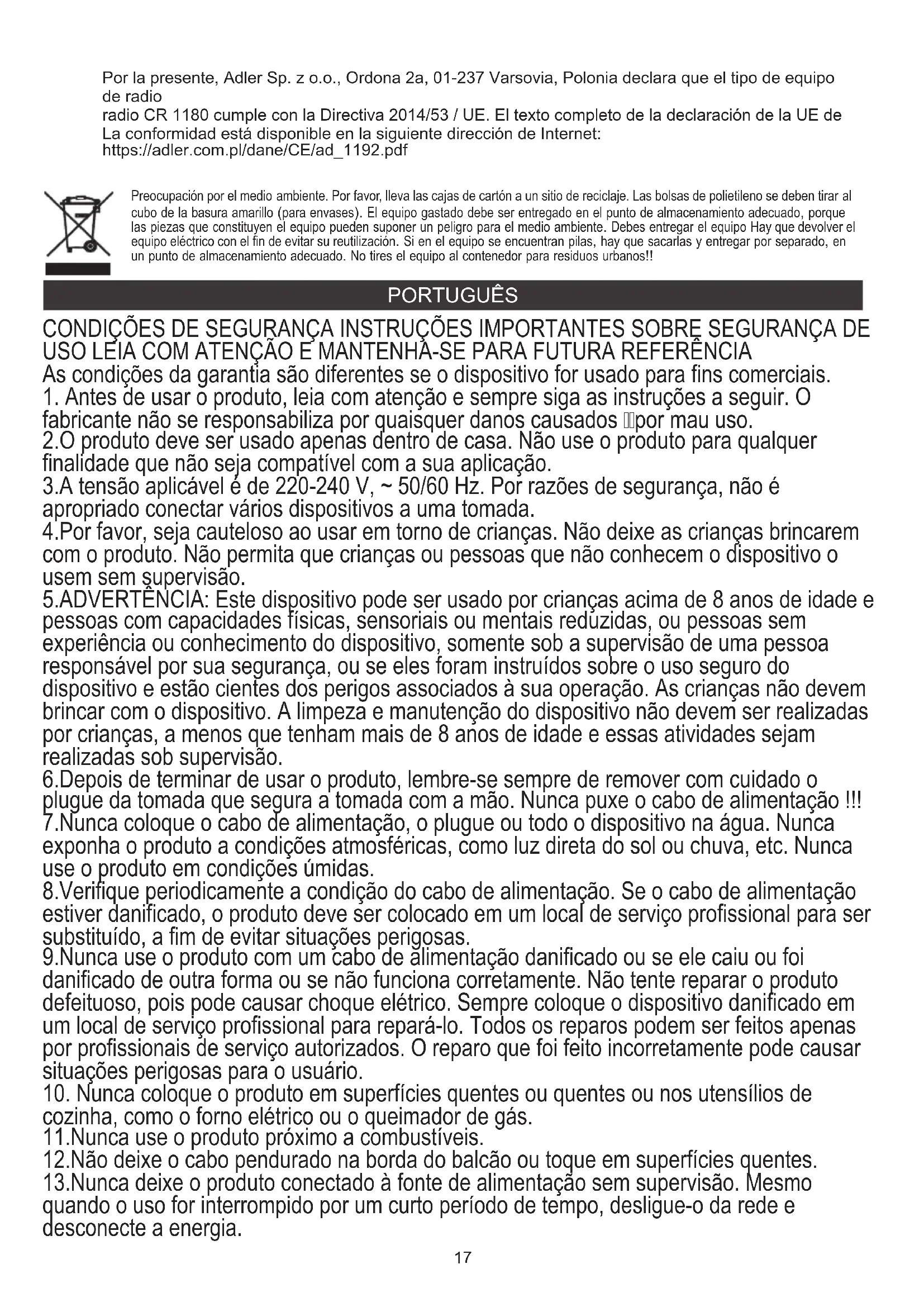 cozinha, como o forno elétrico ou o queimador de gás. 9.Nunca use o produto com um cabo de alimentação danificado ou se ele caiu ou foi danificado de outra forma ou se não funciona corretamente. Não tente reparar o produto defeituoso, pois pode causar choque elétrico. Sempre coloque o dispositivo danificado em um local de serviço profissional para repará-lo. Todos os reparos podem ser feitos apenas por profissionais de serviço autorizados. O reparo que foi feito incorretamente pode causar situações perigosas para o usuário. 8.Verifique periodicamente a condição do cabo de alimentação. Se o cabo de alimentação estiver danificado, o produto deve ser colocado em um local de serviço profissional para ser substituído, a fim de evitar situações perigosas. 7.Nunca coloque o cabo de alimentação, o plugue ou todo o dispositivo na água. Nunca exponha o produto a condições atmosféricas, como luz direta do sol ou chuva, etc. Nunca use o produto em condições úmidas. 6.Depois de terminar de usar o produto, lembre-se sempre de remover com cuidado o plugue da tomada que segura a tomada com a mão. Nunca puxe o cabo de alimentação !!! 5.ADVERTÊNCIA: Este dispositivo pode ser usado por crianças acima de 8 anos de idade e pessoas com capacidades físicas, sensoriais ou mentais reduzidas, ou pessoas sem experiência ou conhecimento do dispositivo, somente sob a supervisão de uma pessoa responsável por sua segurança, ou se eles foram instruídos sobre o uso seguro do dispositivo e estão cientes dos perigos associados à sua operação. As crianças não devem brincar com o dispositivo. A limpeza e manutenção do dispositivo não devem ser realizadas por crianças, a menos que tenham mais de 8 anos de idade e essas atividades sejam realizadas sob supervisão. 4.Por favor, seja cauteloso ao usar em torno de crianças. Não deixe as crianças brincarem com o produto. Não permita que crianças ou pessoas que não conhecem o dispositivo o usem sem supervisão. 3.A tensão aplicável é de 220-240 V, ~ 50/60 Hz. Por razões de segurança, não é apropriado conectar vários dispositivos a uma tomada. 2.O produto deve ser usado apenas dentro de casa. Não use o produto para qualquer finalidade que não seja compatível com a sua aplicação. Preocupación por el medio ambiente. Por favor, lleva las cajas de cartón a un sitio de reciclaje. Las bolsas de polietileno se deben tirar al cubo de la basura amarillo (para envases). El equipo gastado debe ser entregado en el punto de almacenamiento adecuado, porque las piezas que constituyen el equipo pueden suponer un peligro para el medio ambiente. Debes entregar el equipo Hay que devolver el equipo eléctrico con el fin de evitar su reutilización. Si en el equipo se encuentran pilas, hay que sacarlas y entregar por separado, en un punto de almacenamiento adecuado. No tires el equipo al contenedor para residuos urbanos!! Por la presente, Adler Sp. z o.o., Ordona 2a, 01-237 Varsovia, Polonia declara que el tipo de equipo de radio radio CR 1180 cumple con la Directiva 2014/53 / UE. El texto completo de la declaración de la UE de La conformidad está disponible en la siguiente dirección de Internet: https://adler.com.pl/dane/CE/ad_1192.pdf18