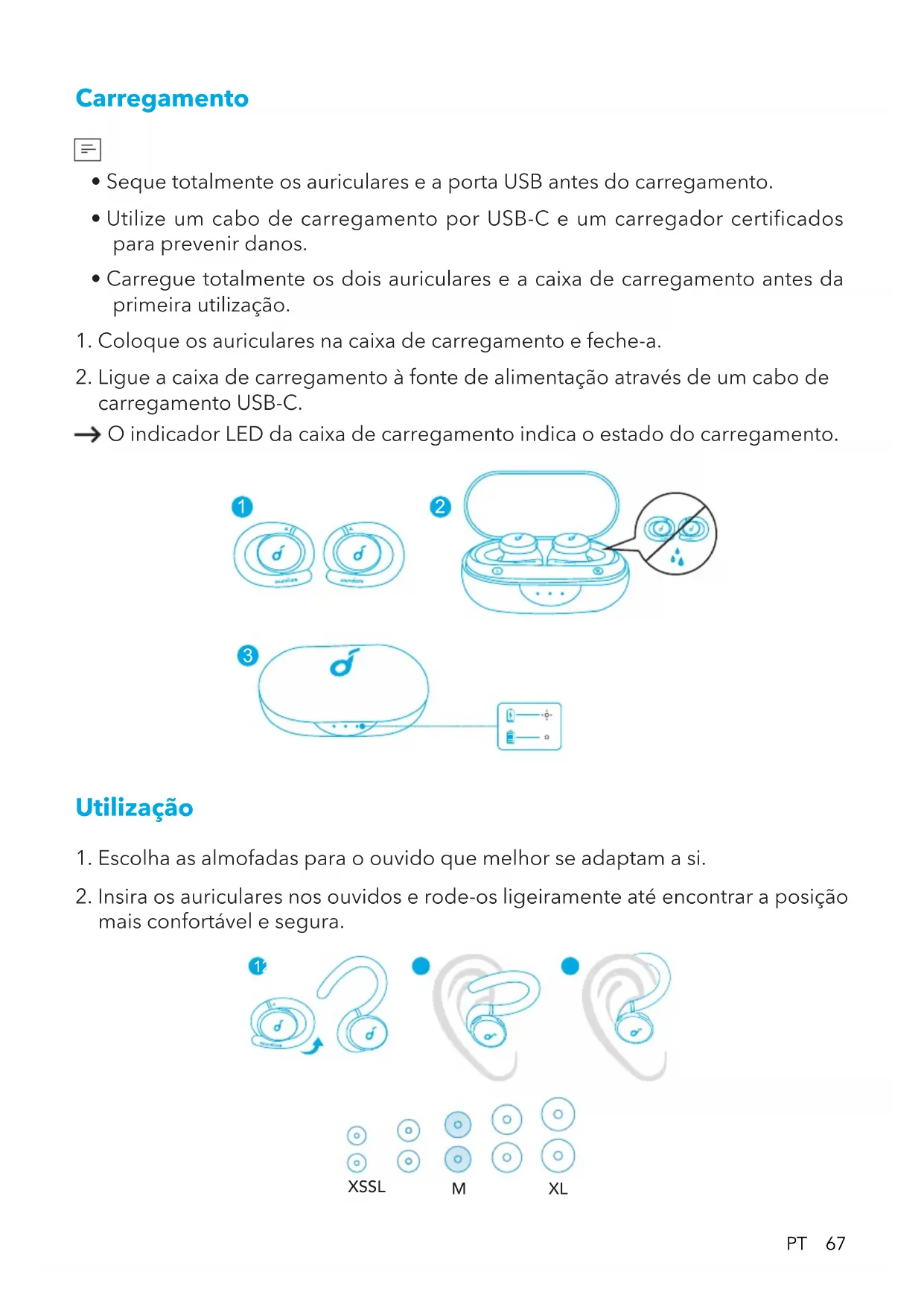 - Carregue totalmente os dois auriculares e a caixa de carregamento antes da primeira utilização.