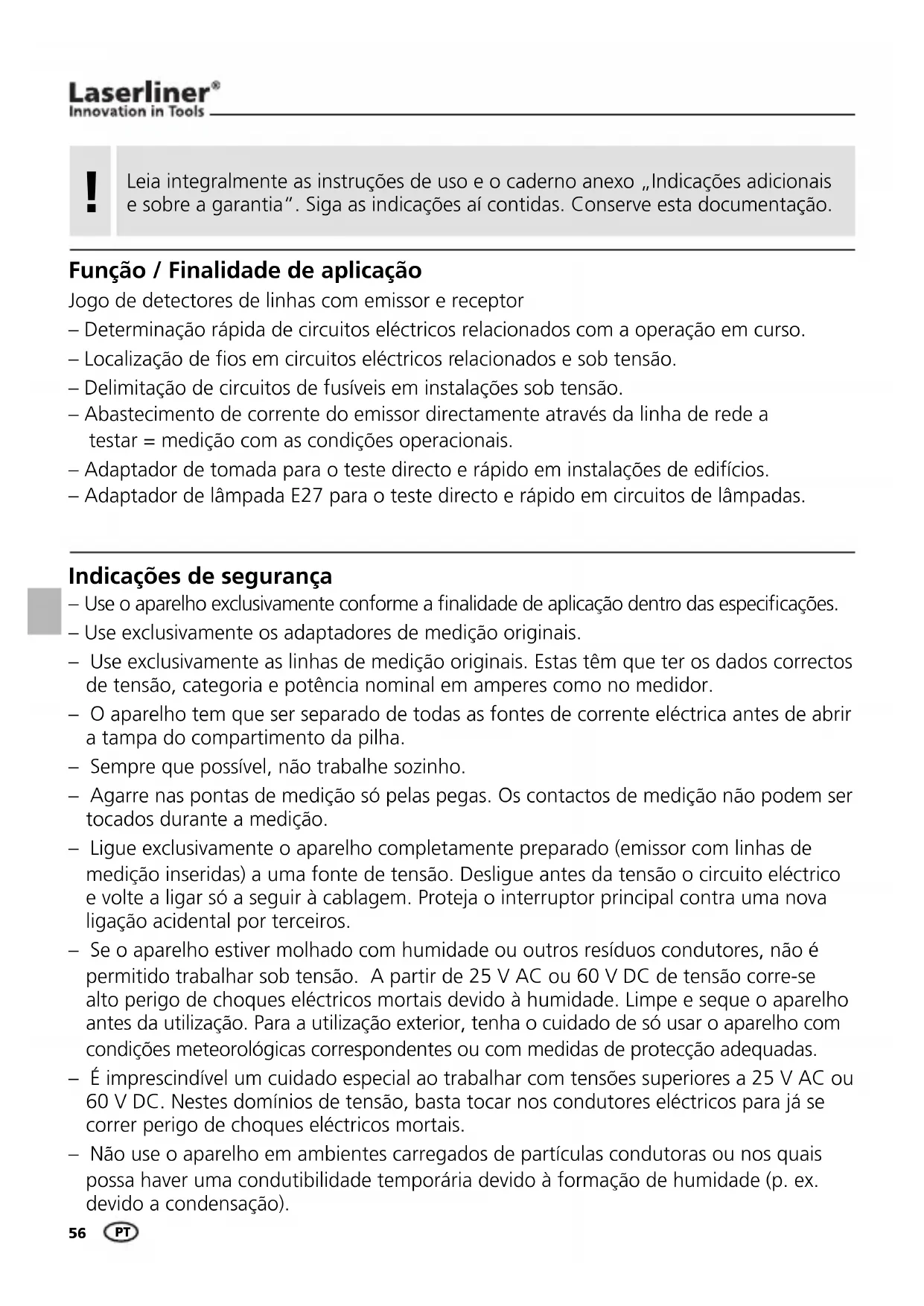 Indicações importantes que devem ser obrigatoriamente cumpridas. Categoria de sobretensões III: equipamento em instalações Ö xas e para os casos nos quais sejam necessários requisitos especiais para a Ö abilidade e a disponibi- lidade dos equipamentos, tais como p. ex. interruptores em instalações Ö xas e aparelhos para o uso industrial com ligação permanente a uma instalação Ö xa. Classe de protecção II: o aparelho dispõe de um isolamento reforçado ou duplo. Aviso de um ponto perigoso Aviso de tensão eléctrica perigosa: os componentes sob tensão não protegidos no interior da caixa podem constituir um perigo suÖ ciente para colocar pessoas sob o risco de um choque eléctrico. Símbolos – Não efectue medições sozinho em proximidades perigosas de instalações eléctricas e só segundo as instruções de um electricista responsável. – Antes de cada medição, assegure-se de que a zona a testar (p. ex. cabo), o veriÖ cador e os acessórios usados (p. ex. cabo de ligação) estão em perfeitas condições.Teste o apa- relho em fontes de tensão conhecidas (p. ex. tomada de 230 V para o teste AC). Não é permitido usar o aparelho se uma ou mais funções falharem. – Não utilize o emissor continuamente, utilize apenas durante o tempo efectivo de me- dição. Depois de uma medição, o emissor (incl. linhas de medição) tem de ser retirado do circuito de medição. – O aparelho não pode ser submetido à acção de humidade nem de líquidos. Para a uti- lização exterior, tenha o cuidado de só usar o aparelho com condições meteorológicas correspondentes ou com medidas de protecção adequadas. – Os aparelhos de medição e seus acessórios não são brinquedos. Mantenha afastado das crianças. – Não use o aparelho em ambientes com gases explosivos ou vapor. – Proteja o aparelho de sujidades e daniÖ cações e assegure um armazenamento seco. – Não é permitido alterar a construção do aparelho. – Por favor observe as normas de segurança das autoridades locais e/ou nacionais relativas à utilização correcta do aparelho.