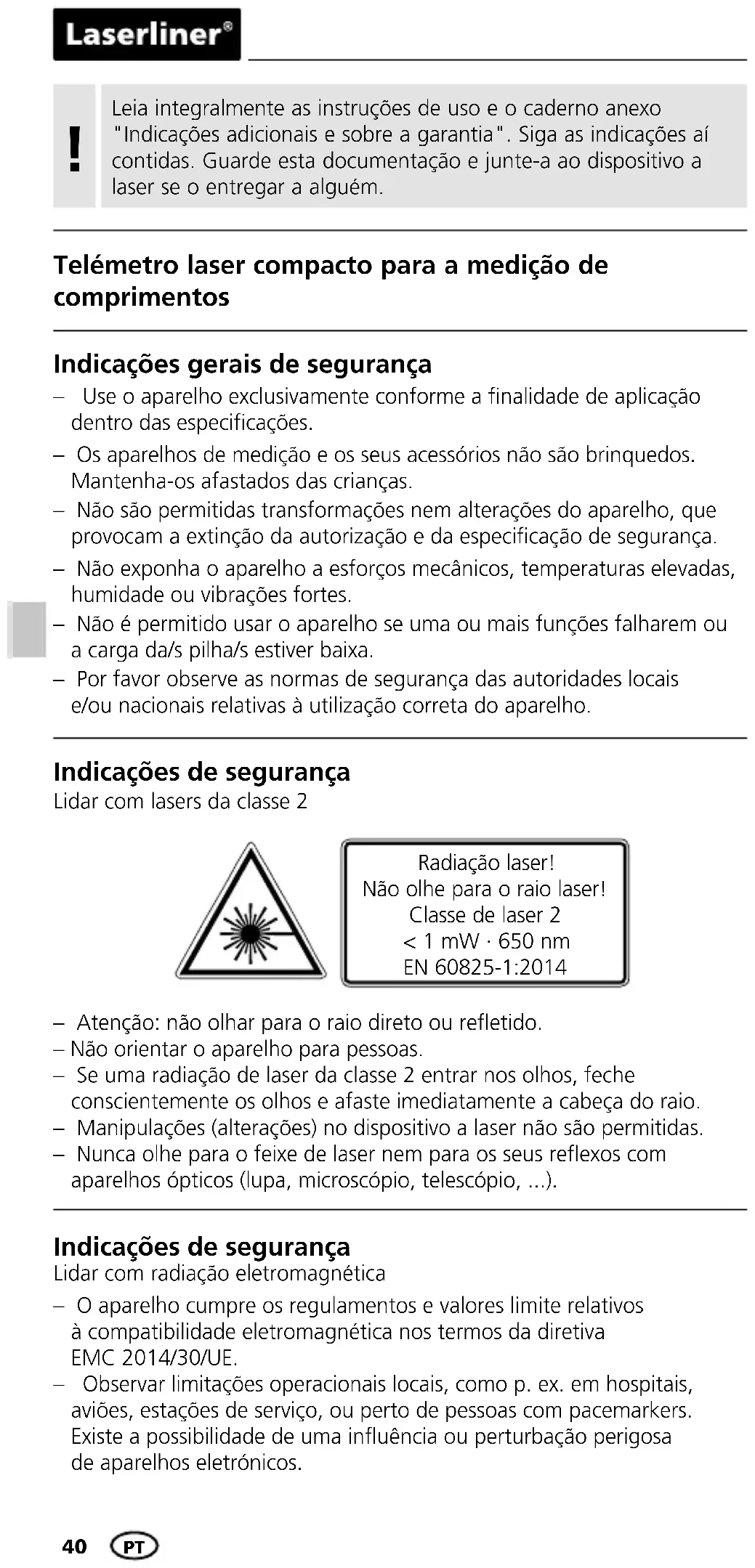 Indicações gerais de segurança – Use o aparelho exclusivamente conforme a nalidade de aplicação dentro das especicações. – Os aparelhos de medição e os seus acessórios não são brinquedos. Mantenha-os afastados das crianças. – Não são permitidas transformações nem alterações do aparelho, que provocam a extinção da autorização e da especicação de segurança. – Não exponha o aparelho a esforços mecânicos, temperaturas elevadas, humidade ou vibrações fortes. – Não é permitido usar o aparelho se uma ou mais funções falharem ou a carga da/s pilha/s estiver baixa. – Por favor observe as normas de segurança das autoridades locais e/ou nacionais relativas à utilização correta do aparelho. – Atenção: não olhar para o raio direto ou reetido. – Não orientar o aparelho para pessoas. – Se uma radiação de laser da classe 2 entrar nos olhos, feche conscientemente os olhos e afaste imediatamente a cabeça do raio. – Manipulações (alterações) no dispositivo a laser não são permitidas. – Nunca olhe para o feixe de laser nem para os seus reexos com aparelhos ópticos (lupa, microscópio, telescópio, ...). Indicações de segurança Lidar com lasers da classe 2 Radiação laser! Não olhe para o raio laser! Classe de laser 2 < 1 mW · 650 nm EN 60825-1:2014 Indicações de segurança Lidar com radiação eletromagnética – O aparelho cumpre os regulamentos e valores limite relativos à compatibilidade eletromagnética nos termos da diretiva EMC 2014/30/UE. – Observar limitações operacionais locais, como p. ex. em hospitais, aviões, estações de serviço, ou perto de pessoas com pacemarkers. Existe a possibilidade de uma inuência ou perturbação perigosa de aparelhos eletrónicos.LaserRange-Master T2