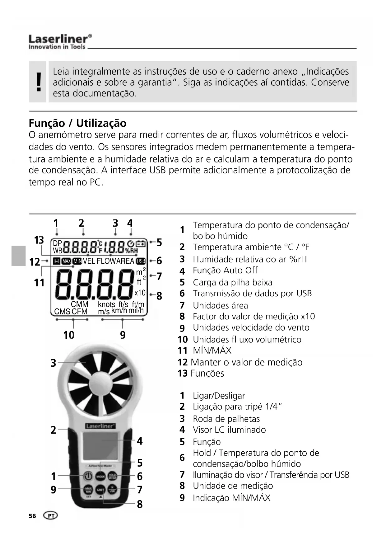 12 Manter o valor de medição 13 Funções Função / Utilização O anemómetro serve para medir correntes de ar, × uxos volumétricos e veloci- dades do vento. Os sensores integrados medem permanentemente a tempera- tura ambiente e a humidade relativa do ar e calculam a temperatura do ponto de condensação. A interface USB permite adicionalmente a protocolização de tempo real no PC. Leia integralmente as instruções de uso e o caderno anexo „Indicações adicionais e sobre a garantia“. Siga as indicações aí contidas. Conserve esta documentação.
