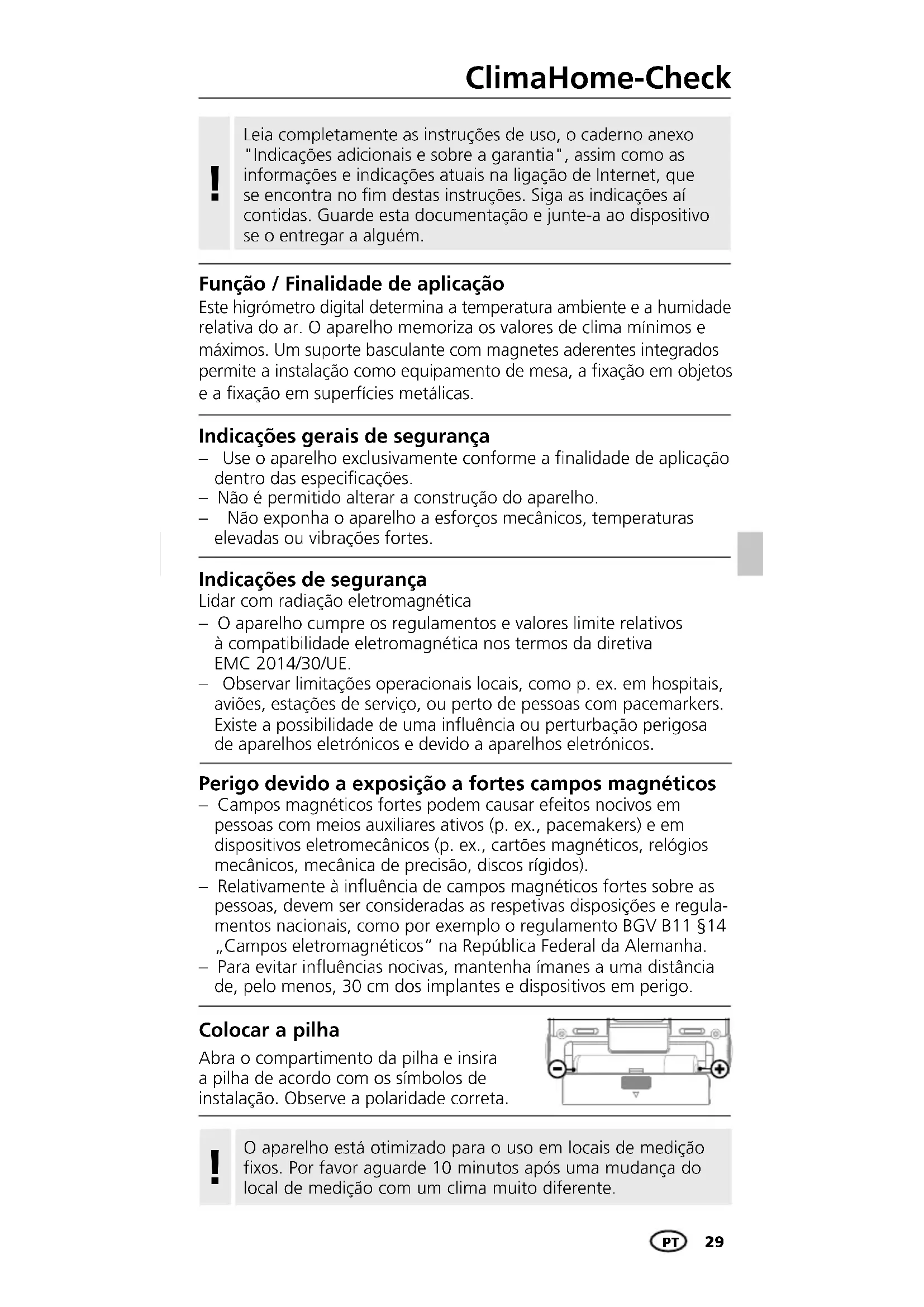 Colocar a pilha Abra o compartimento da pilha e insira a pilha de acordo com os símbolos de instalação. Observe a polaridade correta. Indicações de segurança Lidar com radiação eletromagnética – O aparelho cumpre os regulamentos e valores limite relativos à compatibilidade eletromagnética nos termos da diretiva EMC 2014/30/UE. – Observar limitações operacionais locais, como p. ex. em hospitais, aviões, estações de serviço, ou perto de pessoas com pacemarkers. Existe a possibilidade de uma inuência ou perturbação perigosa de aparelhos eletrónicos e devido a aparelhos eletrónicos. Indicações gerais de segurança – Use o aparelho exclusivamente conforme a nalidade de aplicação dentro das especicações. – Não é permitido alterar a construção do aparelho. – Não exponha o aparelho a esforços mecânicos, temperaturas elevadas ou vibrações fortes. Leia completamente as instruções de uso, o caderno anexo "Indicações adicionais e sobre a garantia", assim como as informações e indicações atuais na ligação de Internet, que se encontra no fim destas instruções. Siga as indicações aí contidas. Guarde esta documentação e junte-a ao dispositivo se o entregar a alguém.