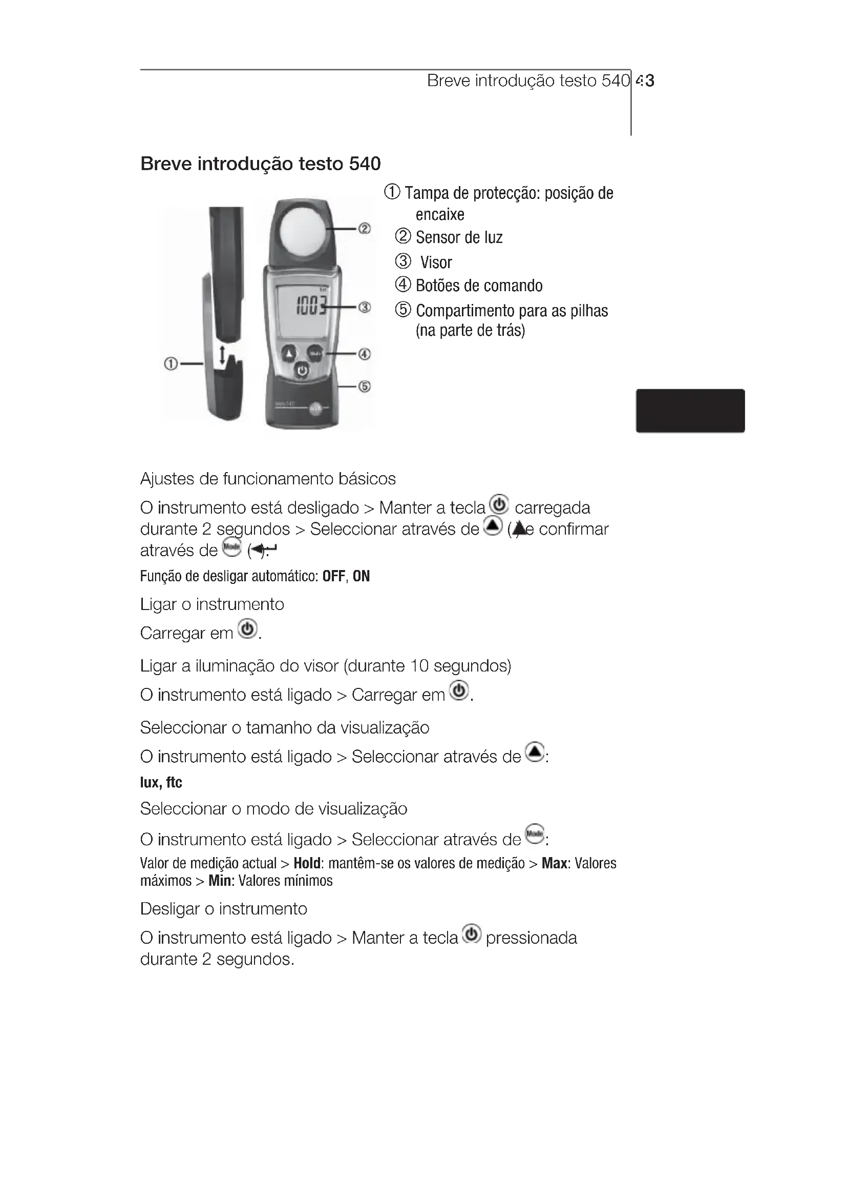 - Duração: 2 anos, condições de garantia: ver www.testo.com/warranty deenfresitptsvnl????Descrição do produto46 Descrição do produto Breve descrição Tampa de protecção: posição de encaixe Sensor de luz Visor Botões de comando Compartimento para as pilhas (na parte de trás) Os primeiros passos Colocar as pilhas: 1 Abrir o compartimento para as pilhas: empurrar a tampa para baixo. 2 Colocar pilhas (2x 1,5 V tipo AAA). Tenha em conta a polaridade correcta. 3 Fechar o compartimento para as pilhas: fechar a tampa. Ajustes de funcionamento básicos (modo de configuração): Funções ajustáveis