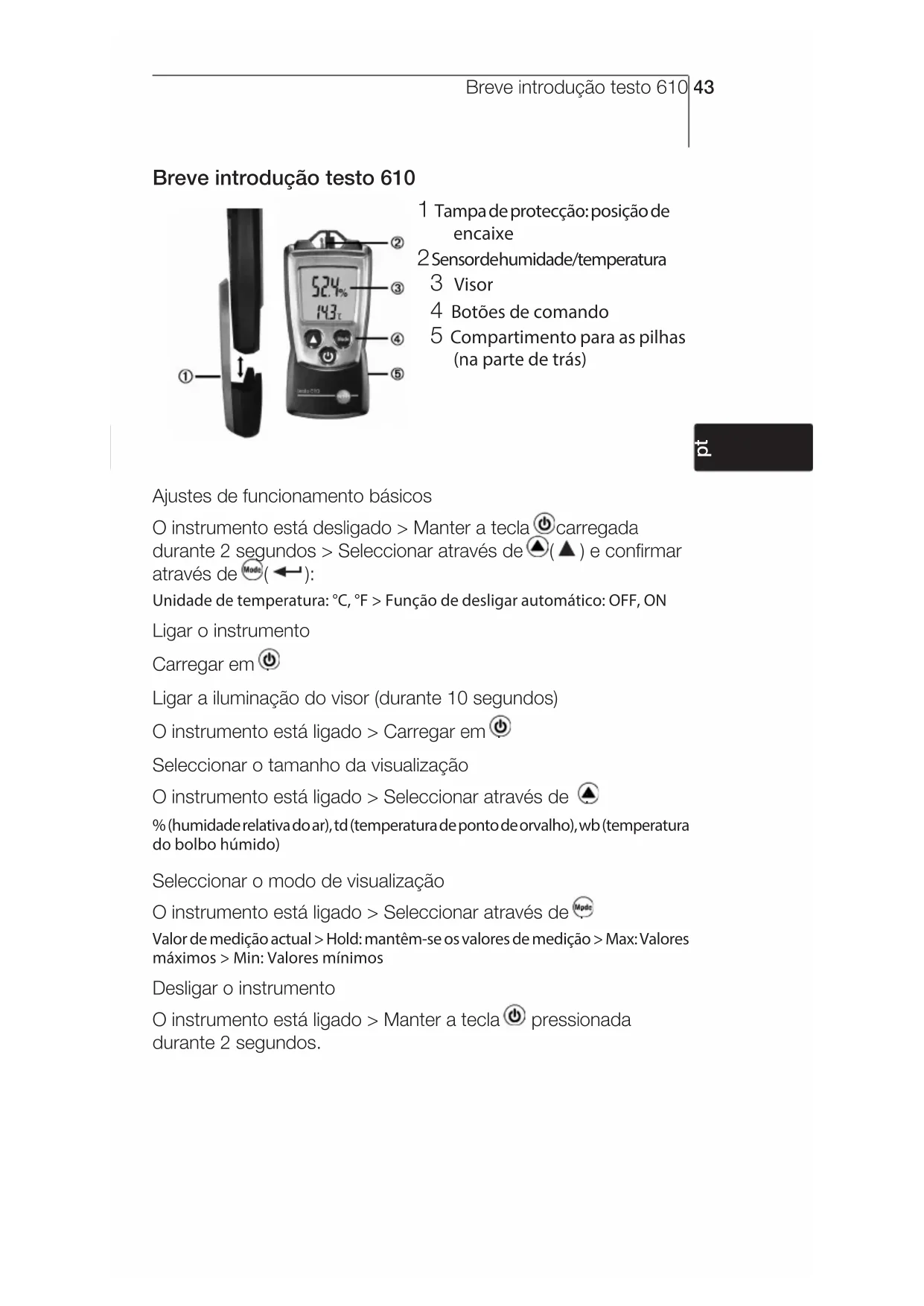 ??Notes42Breve introdução testo 610 43 Breve introdução testo 610 1 Tampa de protecção: posição de encaixe 2 Sensor de humidade/temperatura 3 Visor 4 Botões de comando 5 Compartimento para as pilhas (na parte de trás) Ajustes de funcionamento básicos O instrumento está desligado > Manter a tecla carregada durante 2 segundos > Seleccionar através de ( ) e confirmar através de ( ): Unidade de temperatura: °C, °F > Função de desligar automático: OFF, ON Ligar o instrumento Carregar em . Ligar a iluminação do visor (durante 10 segundos) O instrumento está ligado > Carregar em . Seleccionar o tamanho da visualização O instrumento está ligado > Seleccionar através de : % (humidade relativa do ar), td (temperatura de ponto de orvalho), wb (temperatura do bolbo húmido) Seleccionar o modo de visualização O instrumento está ligado > Seleccionar através de : Valor de medição actual > Hold: mantêm-se os valores de medição > Max: Valores máximos > Min: Valores mínimos Desligar o instrumento O instrumento está ligado > Manter a tecla pressionada durante 2 segundos.