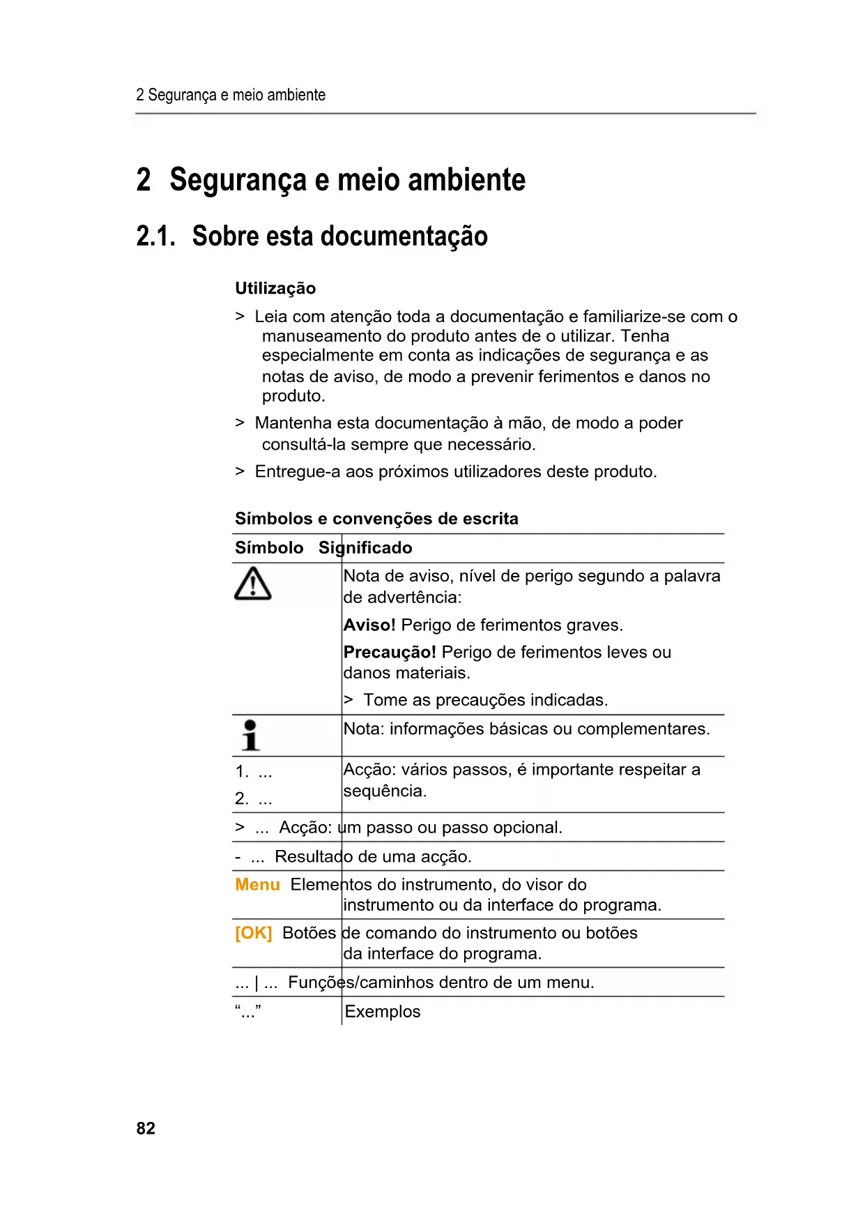 Acção: vários passos, é importante respeitar a sequência. > ... Acção: um passo ou passo opcional. - ... Resultado de uma acção. Menu Elementos do instrumento, do visor do instrumento ou da interface do programa. [OK] Botões de comando do instrumento ou botões da interface do programa. ... | ... Funções/caminhos dentro de um menu. “...” Exemplos2 Segurança e meio ambiente