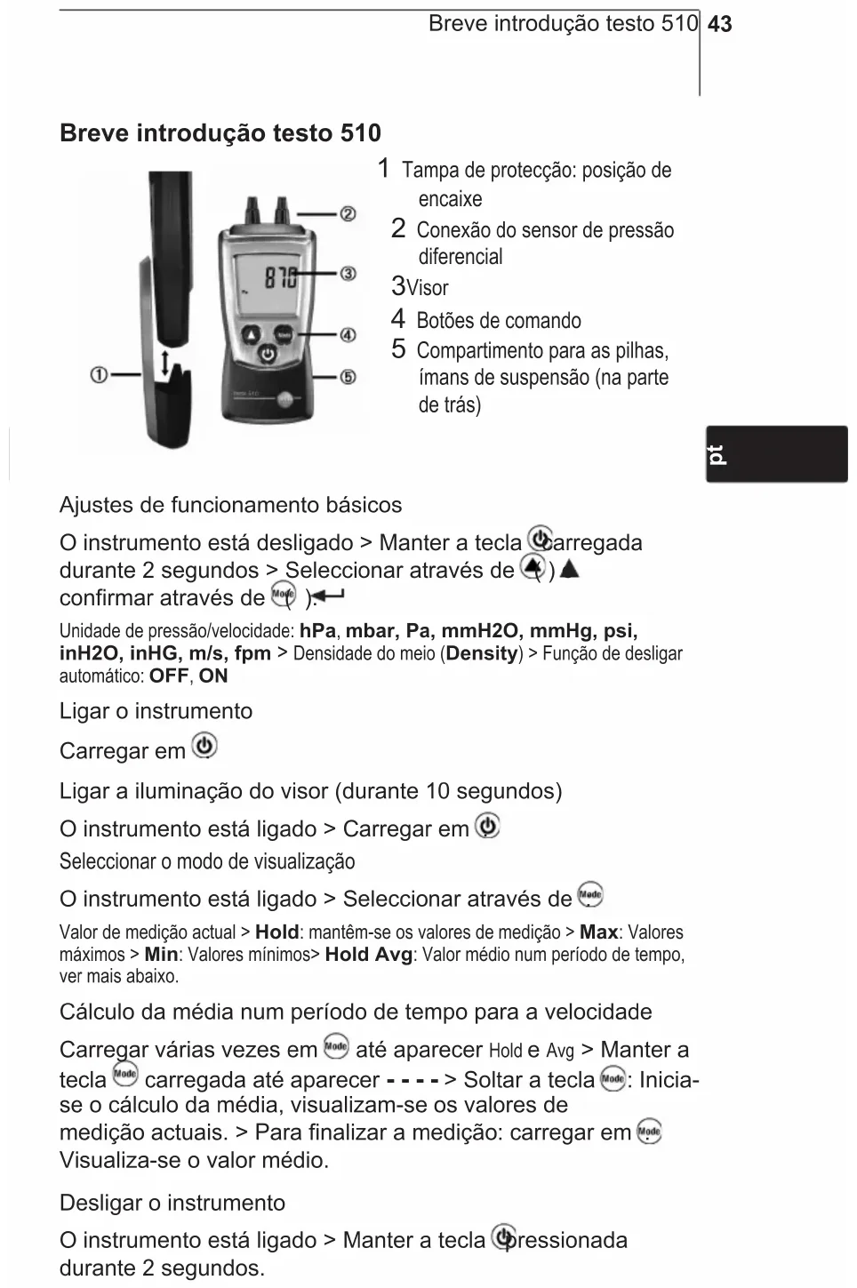 Breve introdução testo 510 1 Tampa de protecção: posição de encaixe 2 Conexão do sensor de pressão diferencial 3 Visor 4 Botões de comando 5 Compartimento para as pilhas, ímans de suspensão (na parte de trás) Ajustes de funcionamento básicos O instrumento está desligado > Manter a tecla carregada durante 2 segundos > Seleccionar através de ( ) e confirmar através de ( ): Unidade de pressão/velocidade: hPa, mbar, Pa, mmH2O, mmHg, psi, inH2O, inHG, m/s, fpm > Densidade do meio (Density) > Função de desligar automático: OFF, ON Ligar o instrumento Carregar em . Ligar a iluminação do visor (durante 10 segundos) O instrumento está ligado > Carregar em . Seleccionar o modo de visualização O instrumento está ligado > Seleccionar através de : Valor de medição actual > Hold: mantêm-se os valores de medição > Max: Valores máximos > Min: Valores mínimos> Hold Avg: Valor médio num período de tempo, ver mais abaixo. Cálculo da média num período de tempo para a velocidade Carregar várias vezes em até aparecer Hold e Avg > Manter a tecla carregada até aparecer - - - - > Soltar a tecla : Inicia- se o cálculo da média, visualizam-se os valores de medição actuais. > Para finalizar a medição: carregar em . Visualiza-se o valor médio. Desligar o instrumento O instrumento está ligado > Manter a tecla pressionada durante 2 segundos.