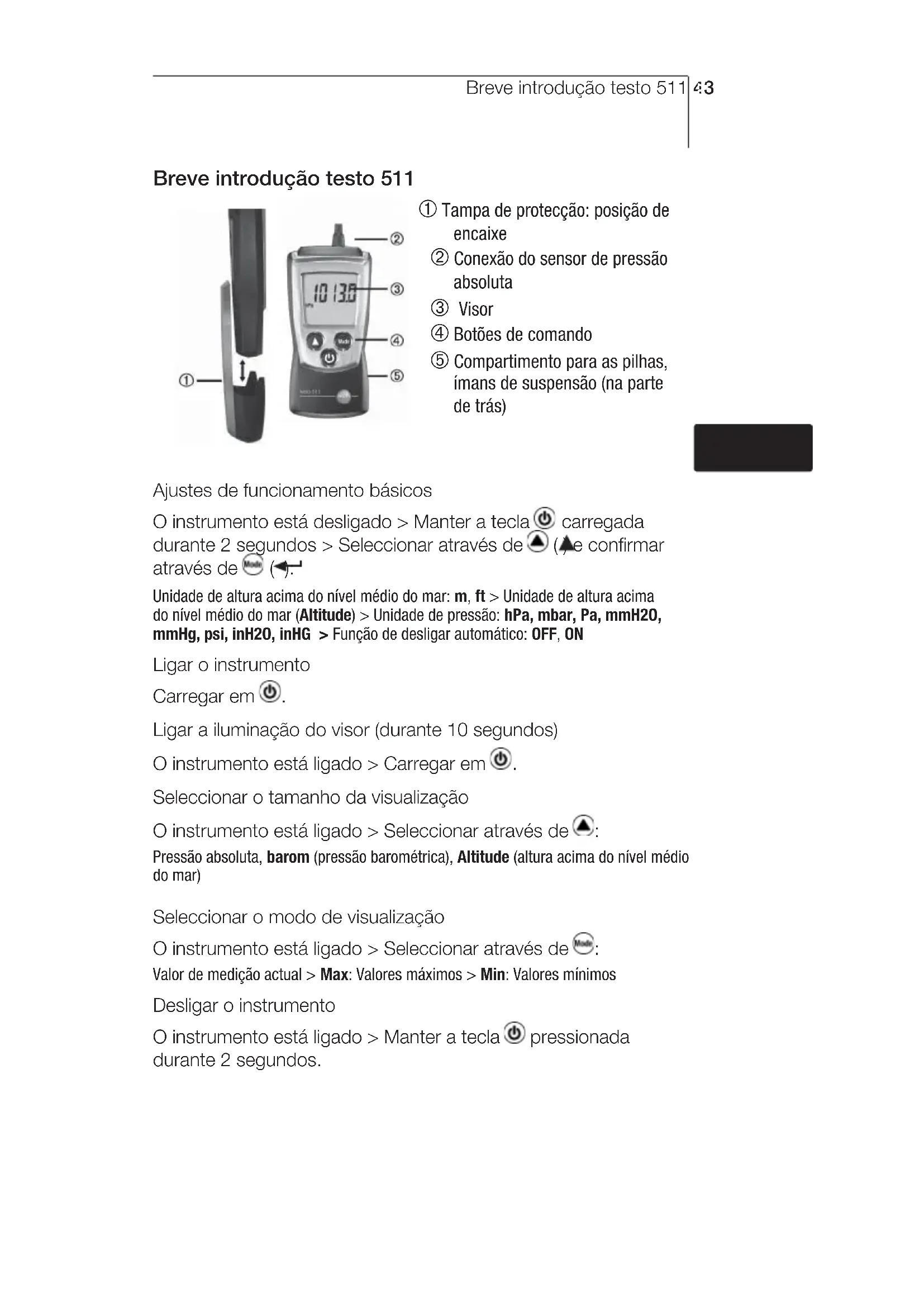 Valor de medição actual > Max: Valores máximos > Min: Valores mínimos Desligar o instrumento O instrumento está ligado > Manter a tecla pressionada durante 2 segundos. deenfresitptsvnl????Segurança e meio ambiente44 Segurança e meio ambiente Sobre esta documentação > Leia com atenção toda a documentação e familiarize-se com o manuseamento do produto antes de o utilizar. Mantenha esta documentação à mão, de modo a poder consultá-la sempre que necessário. Entregue-a aos próximos utilizadores deste produto. > Tenha especialmente em conta as informações realçadas pelos seguintes símbolos: Informação importante. Evitar danos pessoais/danos materiais > Utilizar o produto apenas de forma apropriada e de acordo com a sua finalidade, dentro dos parâmetros mencionados no capítulo „Dados Técnicos“. Não aplicar força. > Nunca guardar este produto junto de dissolventes, ácidos ou outros materiais agressivos. > Levar a cabo apenas as tarefas de manutenção descritas na documentação. Ao fazê-lo, respeitar os passos indicados. Utilizar apenas peças de substituição originais Testo. Campo magnético Pode ser perigoso para a saúde de portadores de um Pacemaker. > Manter uma distância mínima de 15 cm entre o Pacemaker e o aparelho. Campo magnético Danificação de outros aparelhos! > Manter uma distância mínima de segurança em relação a produtos que podem ser danificados por magnetismo (p. ex. monitores, computadores, cartões de crédito). Protecção do meio ambiente > Deitar fora as pilhas recarregáveis avariadas e as pilhas gastas nos pontos de recolha previstos para tal. > Enviar o produto à Testo após este ter chegado ao fim da sua vida útil. Nós nos encarregaremos da sua eliminação ecológica.Especificações 45 Especificações Funções e uso O testo 511 é um instrumento de medição da pressão absoluta. Este instrumento utiliza-se normalmente para a medição da pressão absoluta, p. ex., para a compensação de densidade aquando da medição da velocidade em condutas, em laboratórios e processos de produção. Outros parâmetros medidos são a pressão barométrica (=pressão ao nível do mar) e a altitude acima do nível do mar. Dados técnicos Dados técnicos de medição