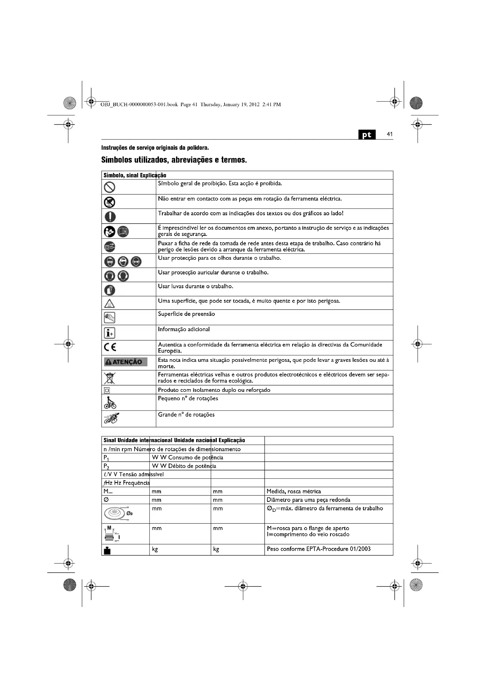 | m, s, kg, A, mm, V, W, Hz, N, °C, dB, min, m/s2 | m, s, kg, A, mm, V, W, Hz, N, °C, dB, min, m/s2 | Unidadesbasicas e deduzidas doSYSTEMA de unida- des internacional SL. | |
