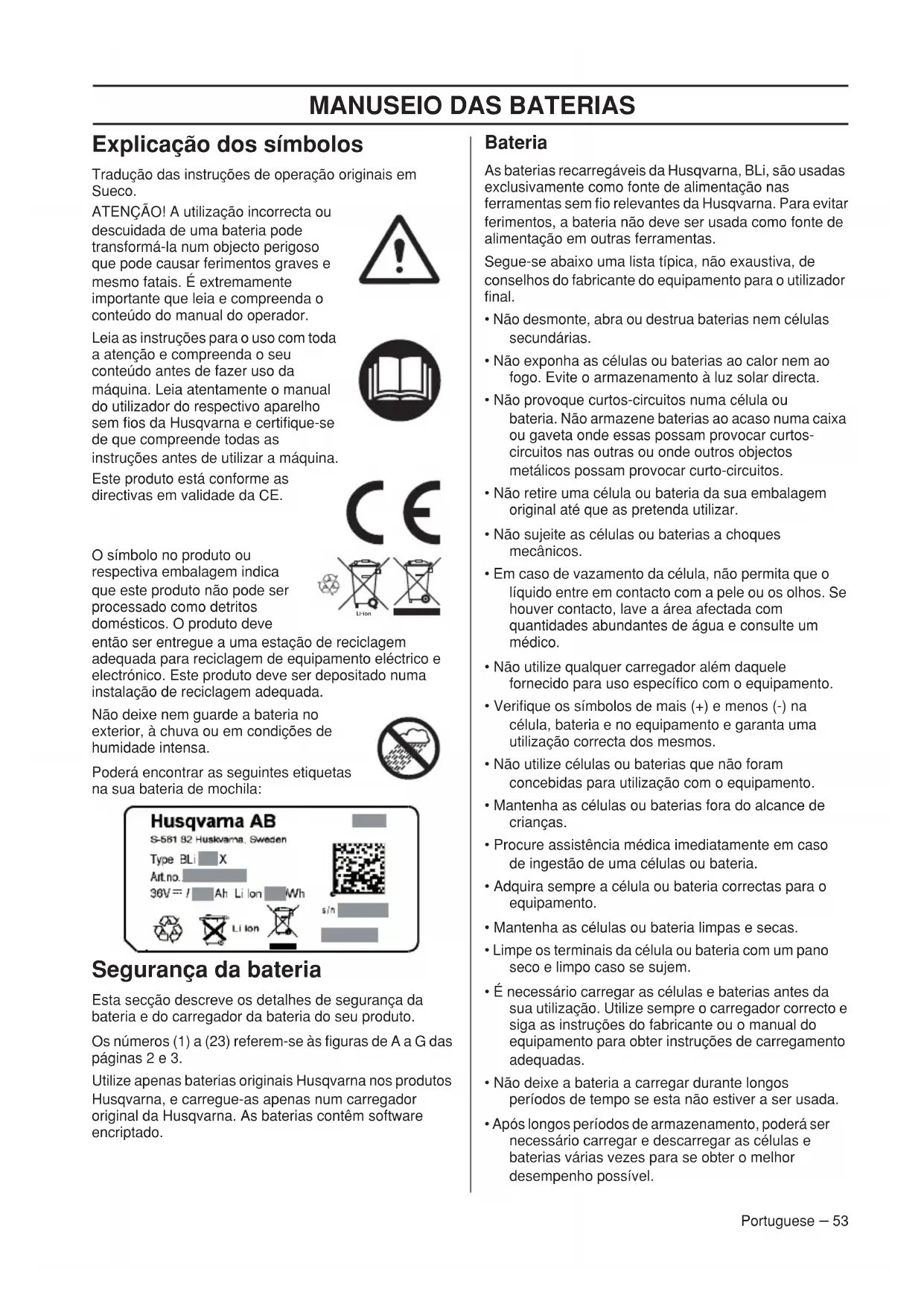 Portuguese – 53 Explicação dos símbolos Tradução das instruções de operação originais em Sueco. ATENÇÃO! A utilização incorrecta ou descuidada de uma bateria pode transformá-la num objecto perigoso que pode causar ferimentos graves e mesmo fatais. É extremamente importante que leia e compreenda o conteúdo do manual do operador. Leia as instruções para o uso com toda a atenção e compreenda o seu conteúdo antes de fazer uso da máquina. Leia atentamente o manual do utilizador do respectivo aparelho sem fios da Husqvarna e certifique-se de que compreende todas as instruções antes de utilizar a máquina. Este produto está conforme as directivas em validade da CE. O símbolo no produto ou respectiva embalagem indica que este produto não pode ser processado como detritos domésticos. O produto deve então ser entregue a uma estação de reciclagem adequada para reciclagem de equipamento eléctrico e electrónico. Este produto deve ser depositado numa instalação de reciclagem adequada. Não deixe nem guarde a bateria no exterior, à chuva ou em condições de humidade intensa. Poderá encontrar as seguintes etiquetas na sua bateria de mochila: Segurança da bateria Esta secção descreve os detalhes de segurança da bateria e do carregador da bateria do seu produto. Os números (1) a (23) referem-se às figuras de A a G das páginas 2 e 3. Utilize apenas baterias originais Husqvarna nos produtos Husqvarna, e carregue-as apenas num carregador original da Husqvarna. As baterias contêm software encriptado. Bateria As baterias recarregáveis da Husqvarna, BLi, são usadas exclusivamente como fonte de alimentação nas ferramentas sem fio relevantes da Husqvarna. Para evitar ferimentos, a bateria não deve ser usada como fonte de alimentação em outras ferramentas. Segue-se abaixo uma lista típica, não exaustiva, de conselhos do fabricante do equipamento para o utilizador final.