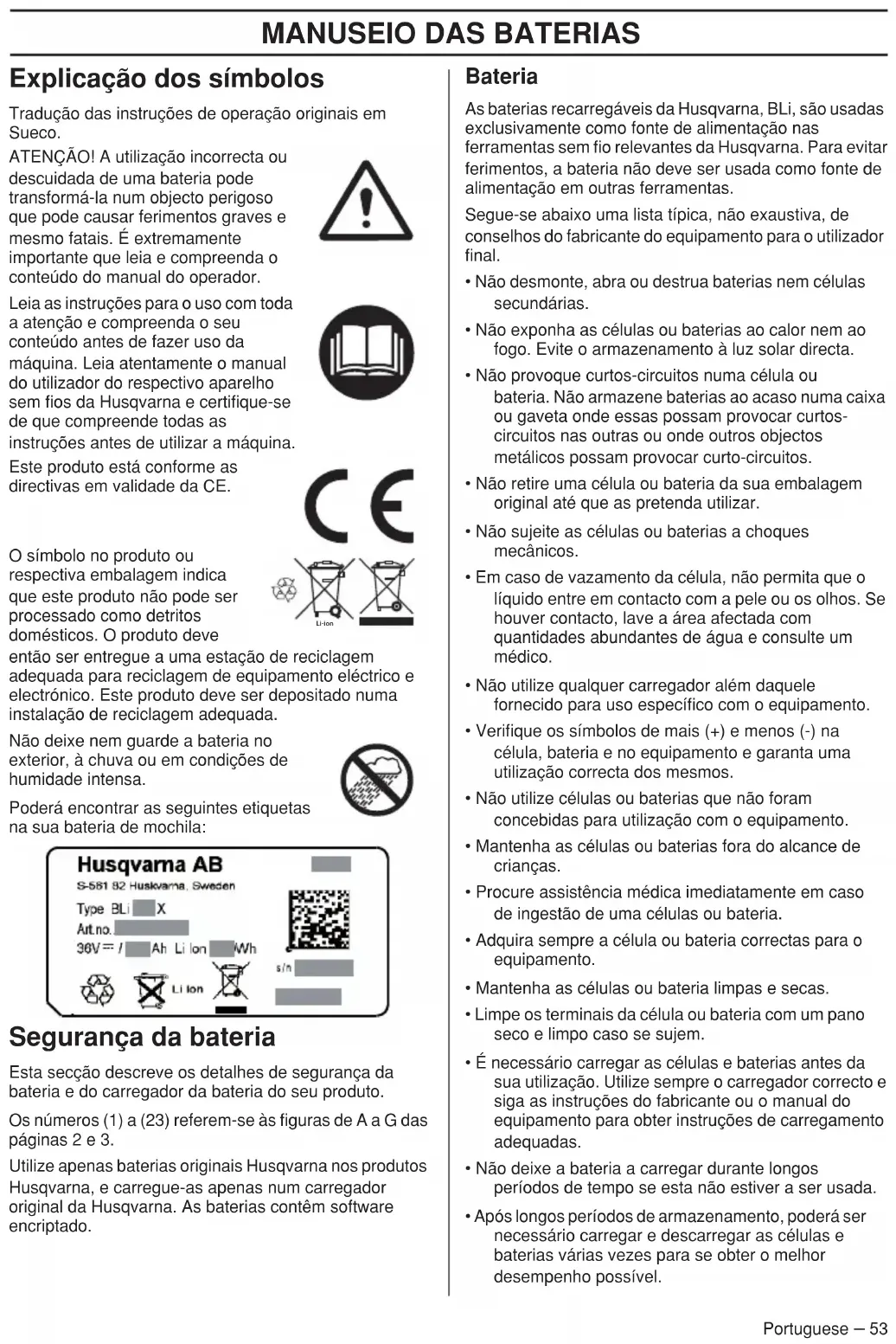 Portuguese – 53 Explicação dos símbolos Tradução das instruções de operação originais em Sueco. ATENÇÃO! A utilização incorrecta ou descuidada de uma bateria pode transformá-la num objecto perigoso que pode causar ferimentos graves e mesmo fatais. É extremamente importante que leia e compreenda o conteúdo do manual do operador. Leia as instruções para o uso com toda a atenção e compreenda o seu conteúdo antes de fazer uso da máquina. Leia atentamente o manual do utilizador do respectivo aparelho sem fios da Husqvarna e certifique-se de que compreende todas as instruções antes de utilizar a máquina. Este produto está conforme as directivas em validade da CE. O símbolo no produto ou respectiva embalagem indica que este produto não pode ser processado como detritos domésticos. O produto deve então ser entregue a uma estação de reciclagem adequada para reciclagem de equipamento eléctrico e electrónico. Este produto deve ser depositado numa instalação de reciclagem adequada. Não deixe nem guarde a bateria no exterior, à chuva ou em condições de humidade intensa. Poderá encontrar as seguintes etiquetas na sua bateria de mochila: Segurança da bateria Esta secção descreve os detalhes de segurança da bateria e do carregador da bateria do seu produto. Os números (1) a (23) referem-se às figuras de A a G das páginas 2 e 3. Utilize apenas baterias originais Husqvarna nos produtos Husqvarna, e carregue-as apenas num carregador original da Husqvarna. As baterias contêm software encriptado. Bateria As baterias recarregáveis da Husqvarna, BLi, são usadas exclusivamente como fonte de alimentação nas ferramentas sem fio relevantes da Husqvarna. Para evitar ferimentos, a bateria não deve ser usada como fonte de alimentação em outras ferramentas. Segue-se abaixo uma lista típica, não exaustiva, de conselhos do fabricante do equipamento para o utilizador final.