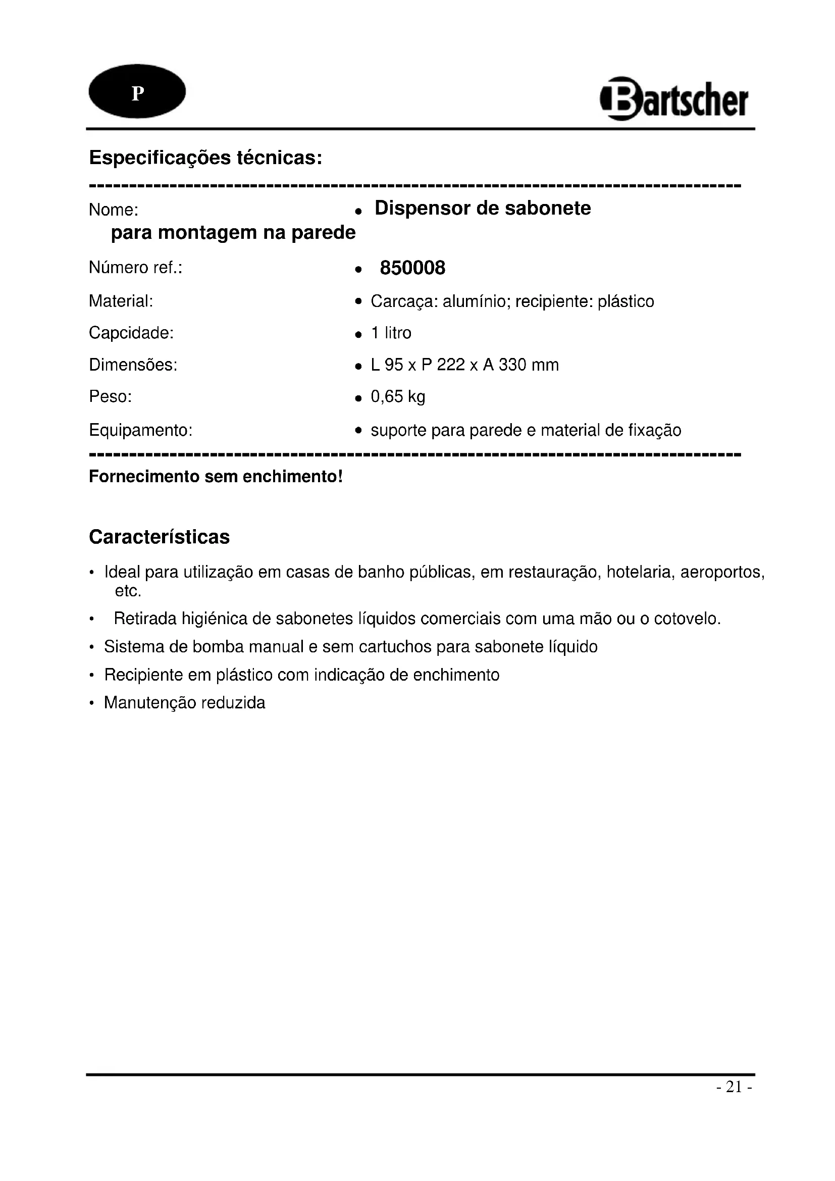 850008 - Dispensador de sabão BARTSCHER - Manual de utilização gratuito