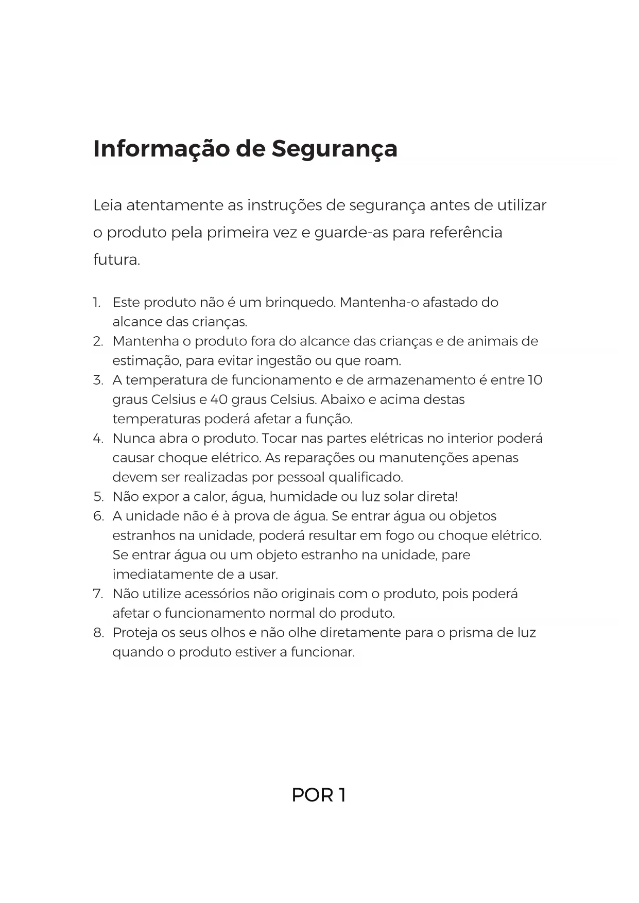 POR 1 Este produto não é um brinquedo. Mantenha-o afastado do alcance das crianças. Mantenha o produto fora do alcance das crianças e de animais de estimação, para evitar ingestão ou que roam. A temperatura de funcionamento e de armazenamento é entre 10 graus Celsius e 40 graus Celsius. Abaixo e acima destas temperaturas poderá afetar a função. Nunca abra o produto. Tocar nas partes elétricas no interior poderá causar choque elétrico. As reparações ou manutenções apenas devem ser realizadas por pessoal qualificado. Não expor a calor, água, humidade ou luz solar direta! A unidade não é à prova de água. Se entrar água ou objetos estranhos na unidade, poderá resultar em fogo ou choque elétrico. Se entrar água ou um objeto estranho na unidade, pare imediatamente de a usar. Não utilize acessórios não originais com o produto, pois poderá afetar o funcionamento normal do produto. Proteja os seus olhos e não olhe diretamente para o prisma de luz quando o produto estiver a funcionar. Leia atentamente as instruções de segurança antes de utilizar o produto pela primeira vez e guarde-as para referência futura.Luz de festa com telecomando