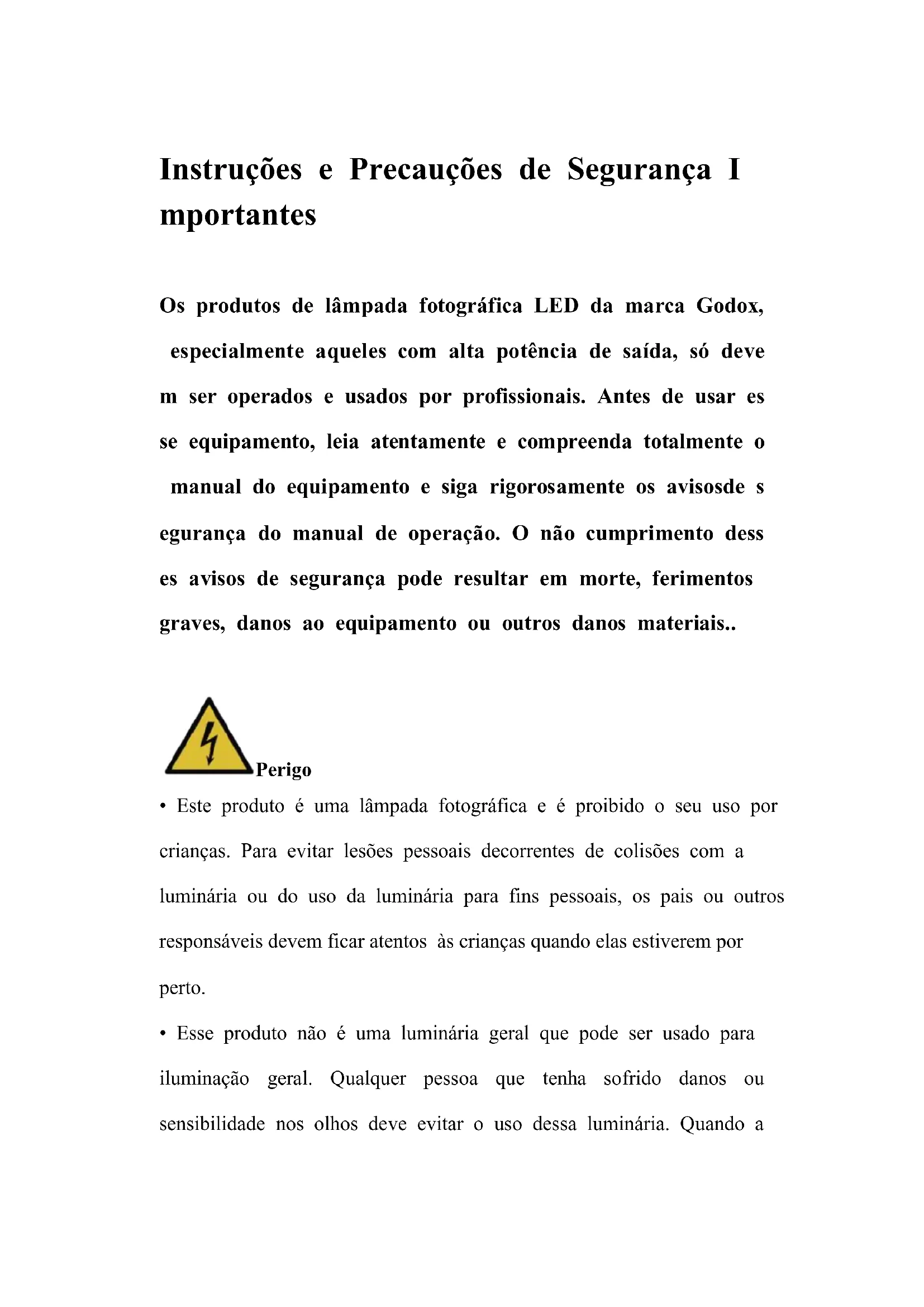 Risco de luz IVAviso, superfície quente!Instruções e Precauções de Segurança I mportantes Os produtos de lâmpada fotográfica LED da marca Godox, especialmente aqueles com alta potência de saída, só deve m ser operados e usados por profissionais. Antes de usar es se equipamento, leia atentamente e compreenda totalmente o manual do equipamento e siga rigorosamente os avisosde s egurança do manual de operação. O não cumprimento dess es avisos de segurança pode resultar em morte, ferimentos graves, danos ao equipamento ou outros danos materiais.. Perigo